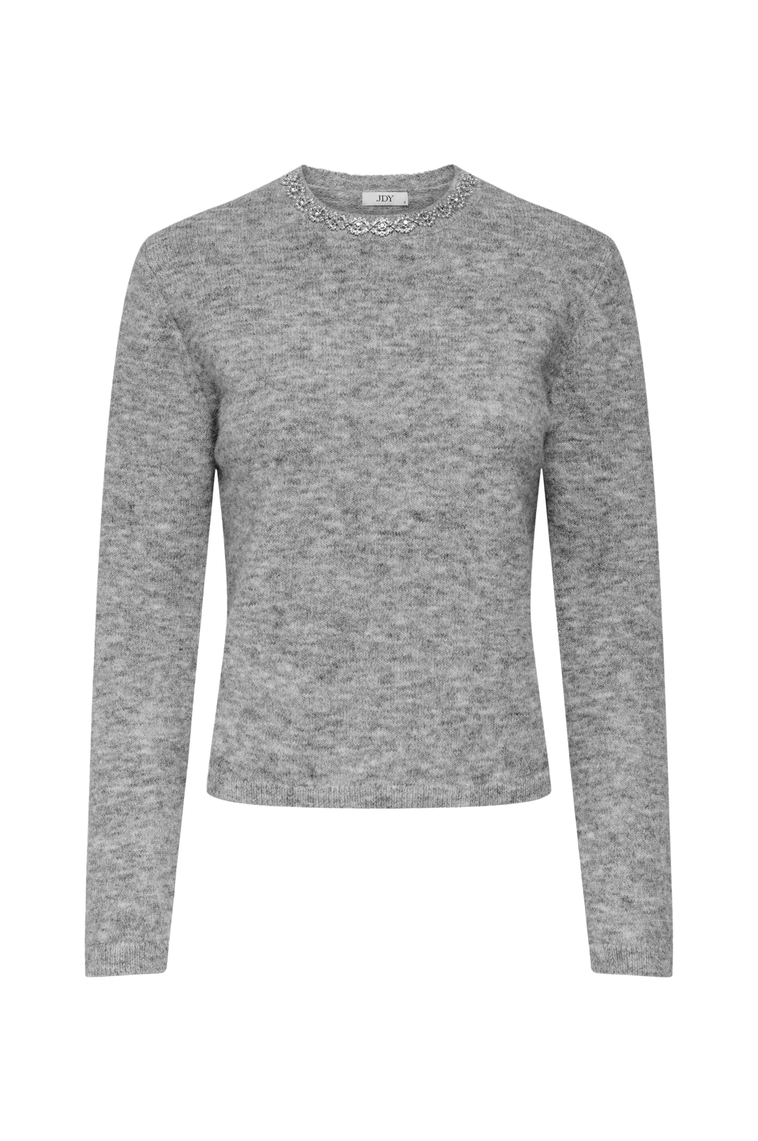 • Finstrikket pullover med dekorative rhinstener langs halsringningen