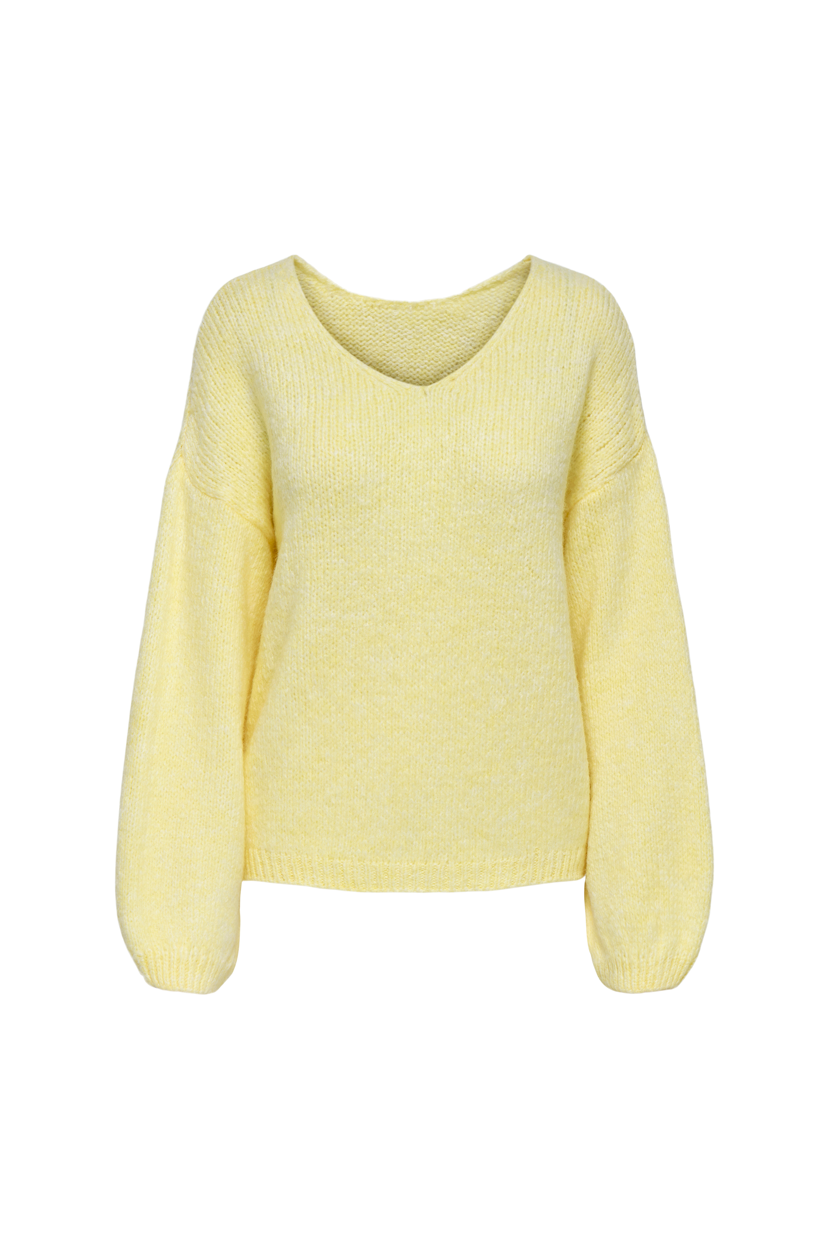 • Strikket pullover i akryl• Langt ballongerme med ribbestrikk i ermeslutten og utringede skuldre• V-formet hals• Ribbestrikk i nedre kant• Normal passform