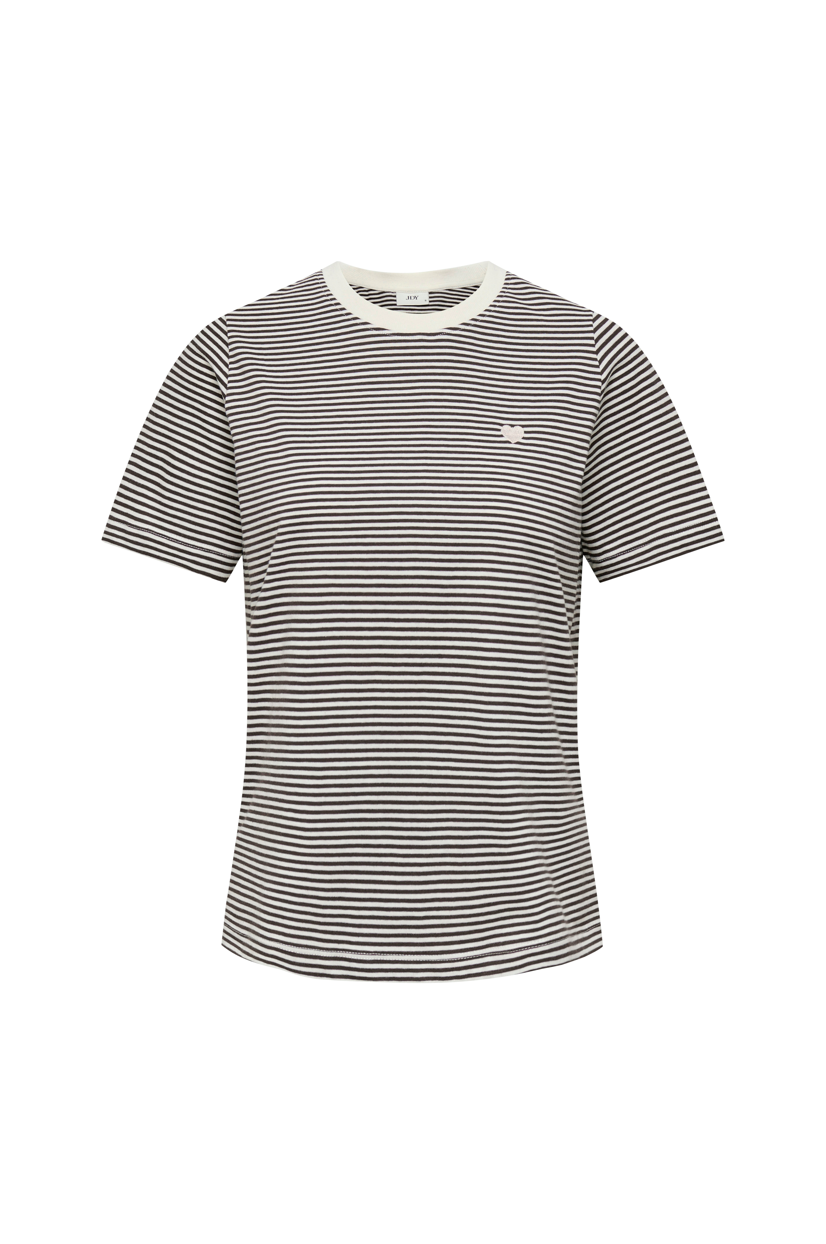 • Lite, brodert hjerte på brystet• Rund, ribbet hals• Korte ermer