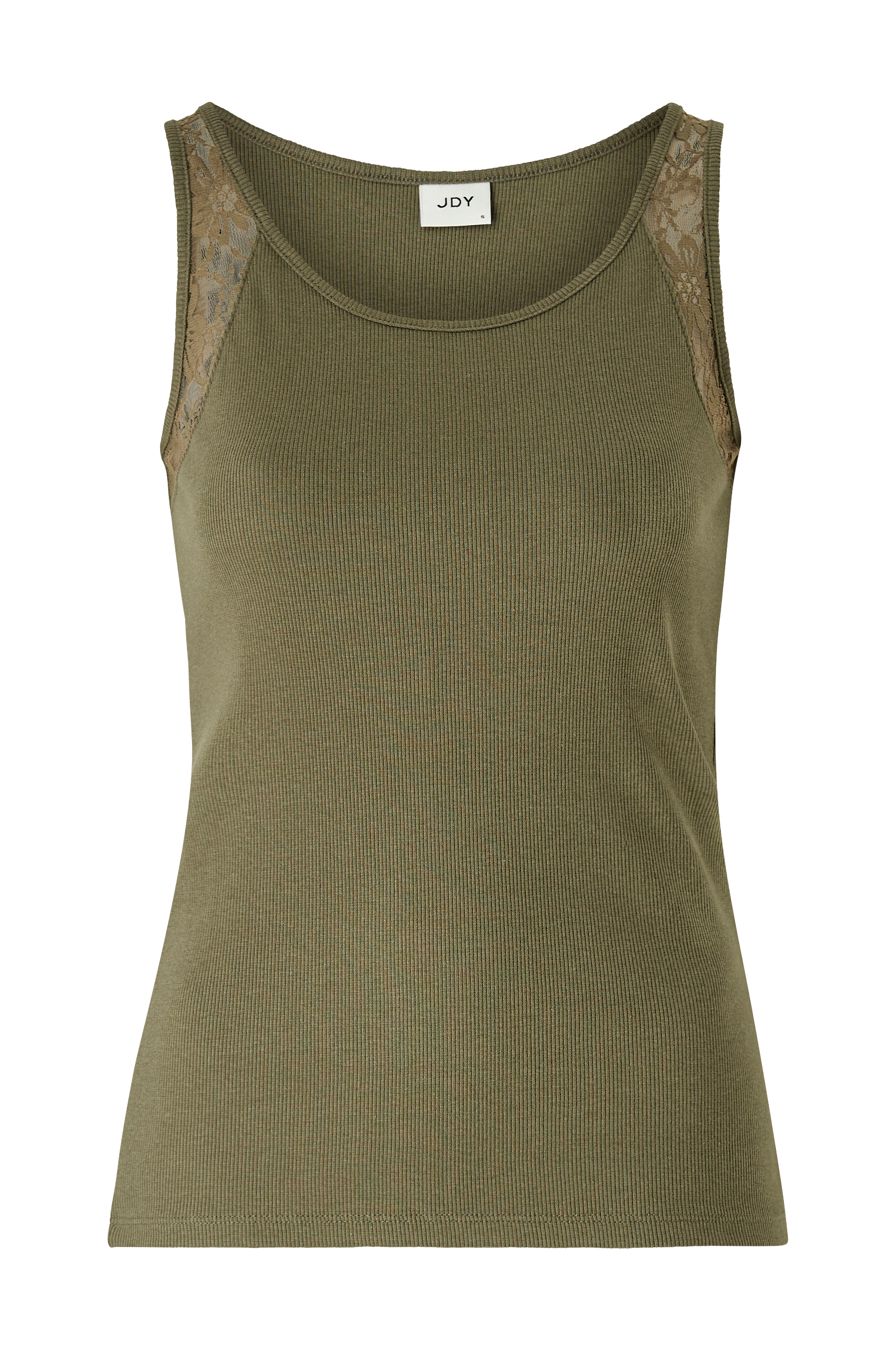 Topp jdyEmmy S/L Lace Top fra Jacqueline de Yong i ribbestrikket trikot med blonde foran langs skulderbåndene.