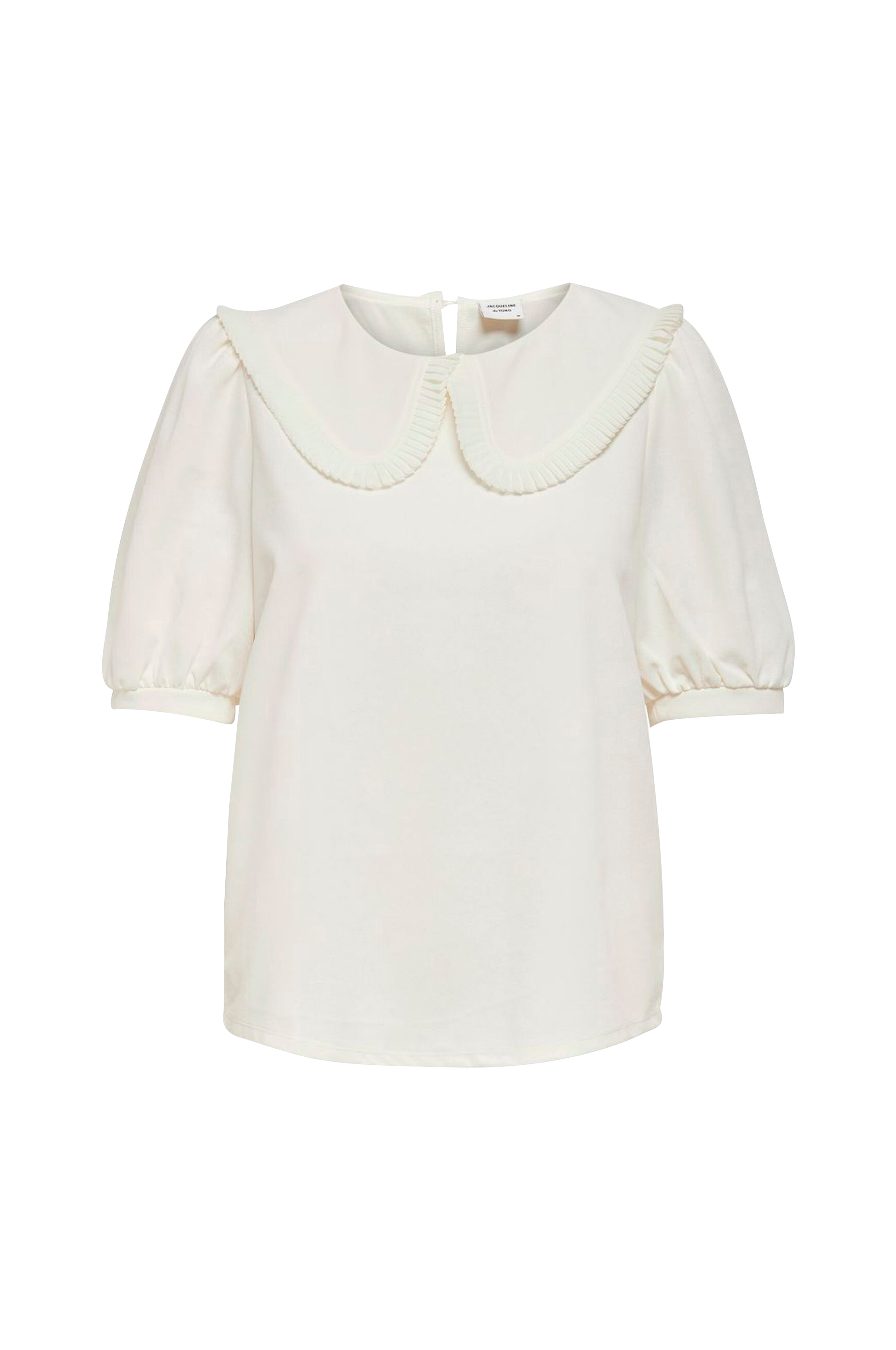 Topp i kraftig trikot med bred volangkrage med foldet kant. Splitt og knapp i nakken. Korte puffermer med smal vrangbord i ermekantene.