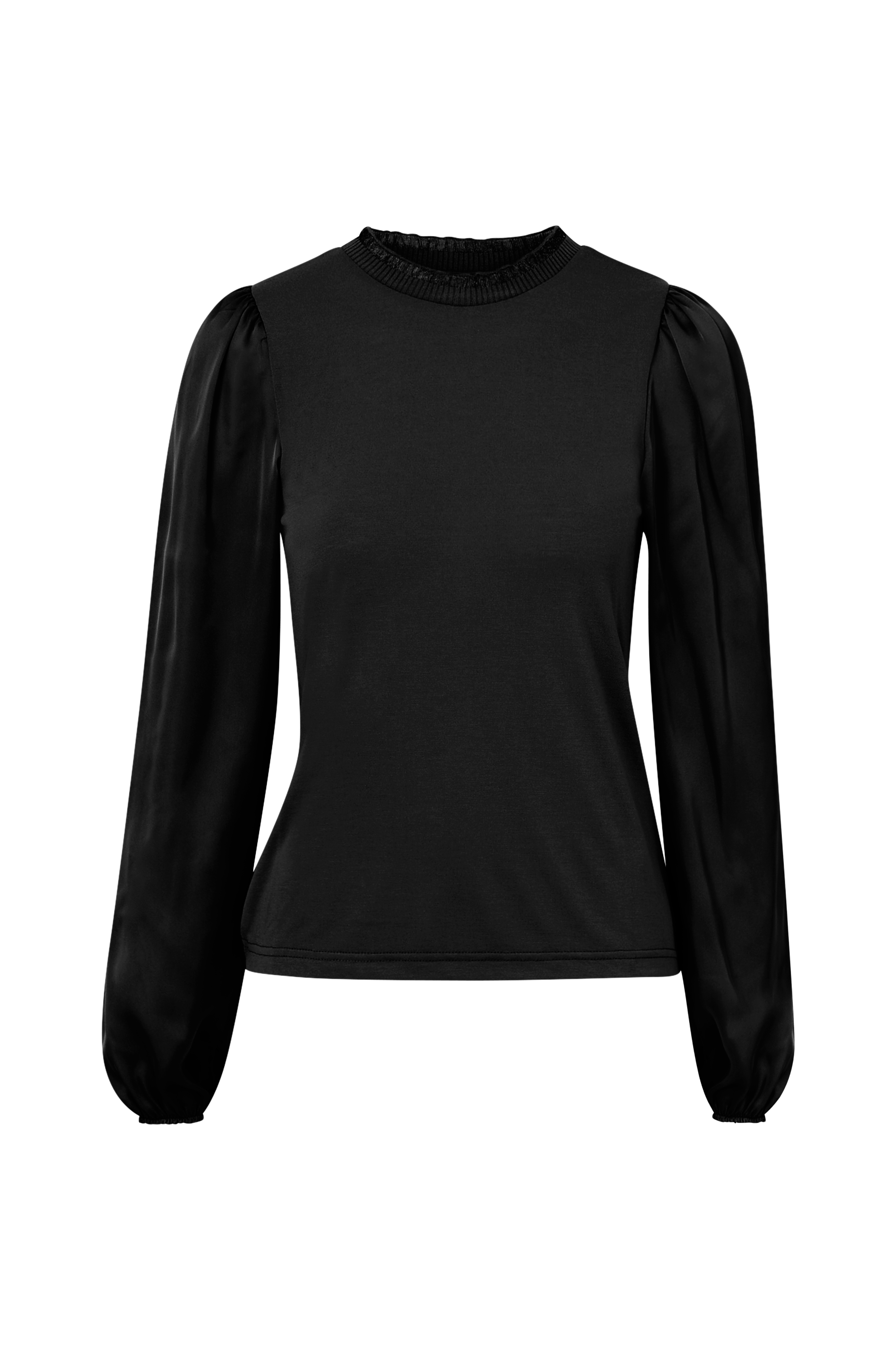 Topp jdyMaggie L/S Mix Top fra Jacqueline de Yong. Rett modell i myk jersey med rund hals som har lett glitrende, ribbestrikket kant. Vide puffermer i vevd sateng med rynker ved skuldrene og innfelt strikk i ermekantene.