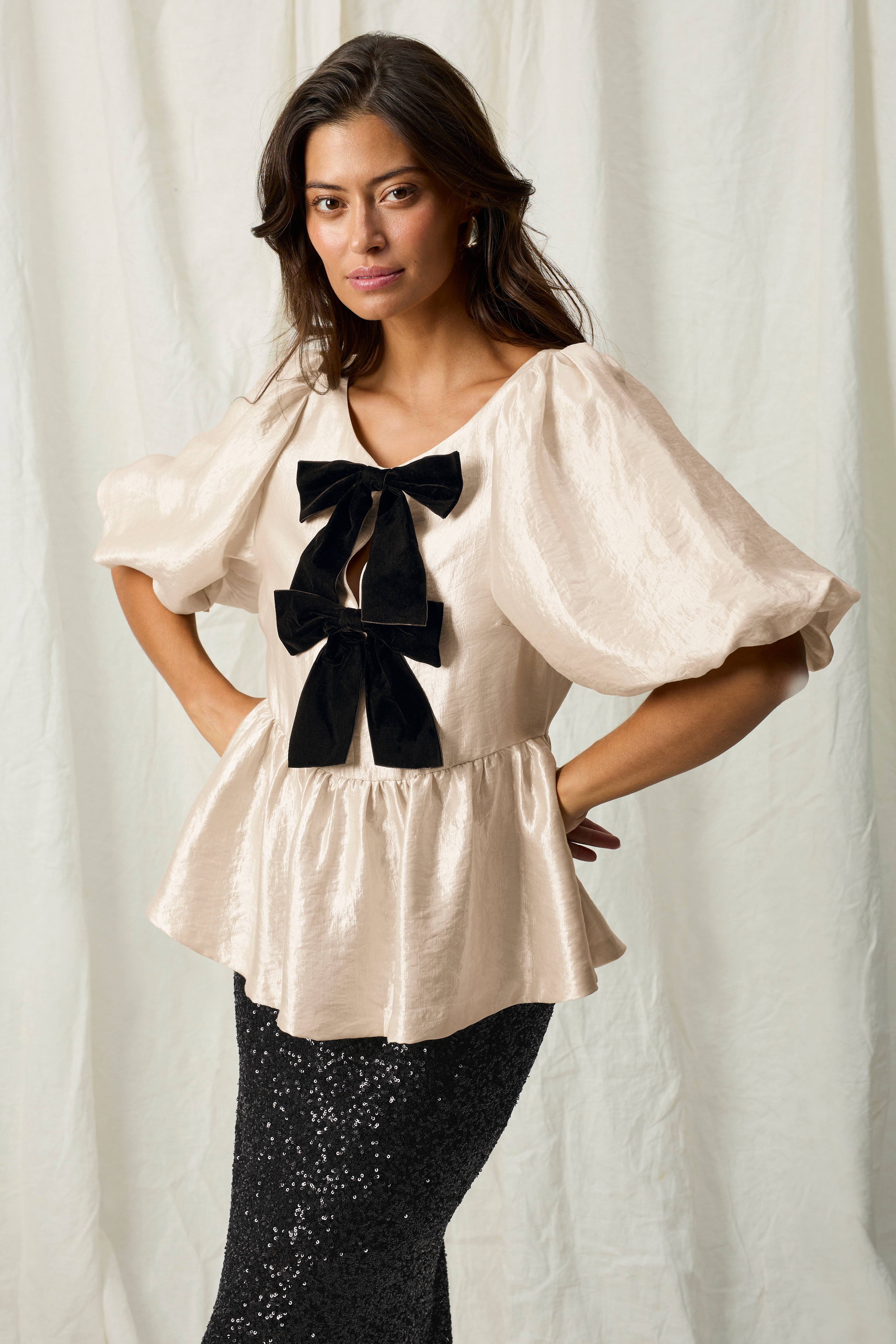 • Utsvingt modell i sateng• Bredt ballongerme• Rund hals med ventilasjon på brystet og store, avtagbare sløyfer• Definert midje med peplum-design• Lengde: 64 cm i størrelse 36