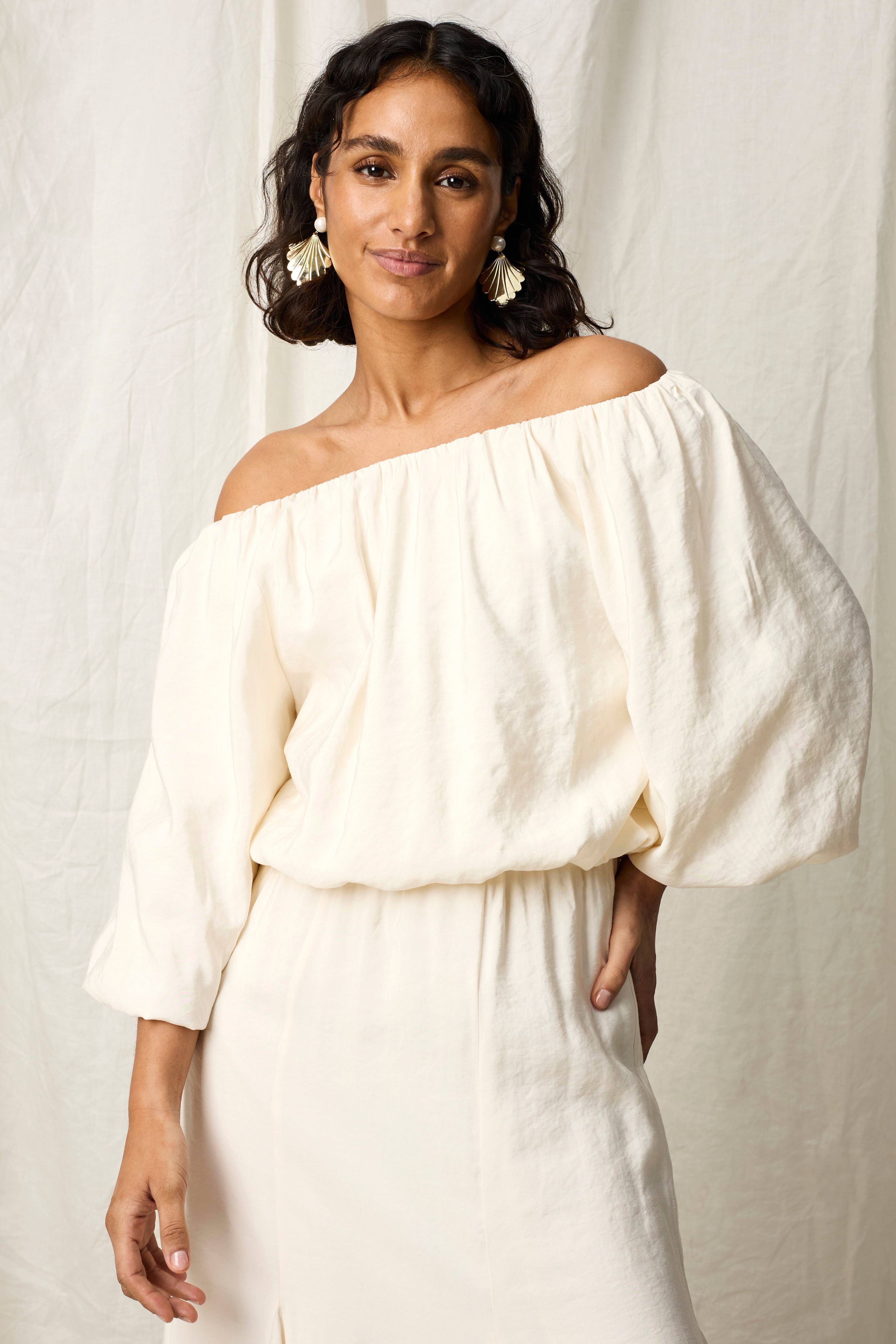 • Bluse med bare skuldre• Puffete modell• Elastisk hals• Bobleermer 3/4 lang• Lengde: 40 cm i størrelse 34/36