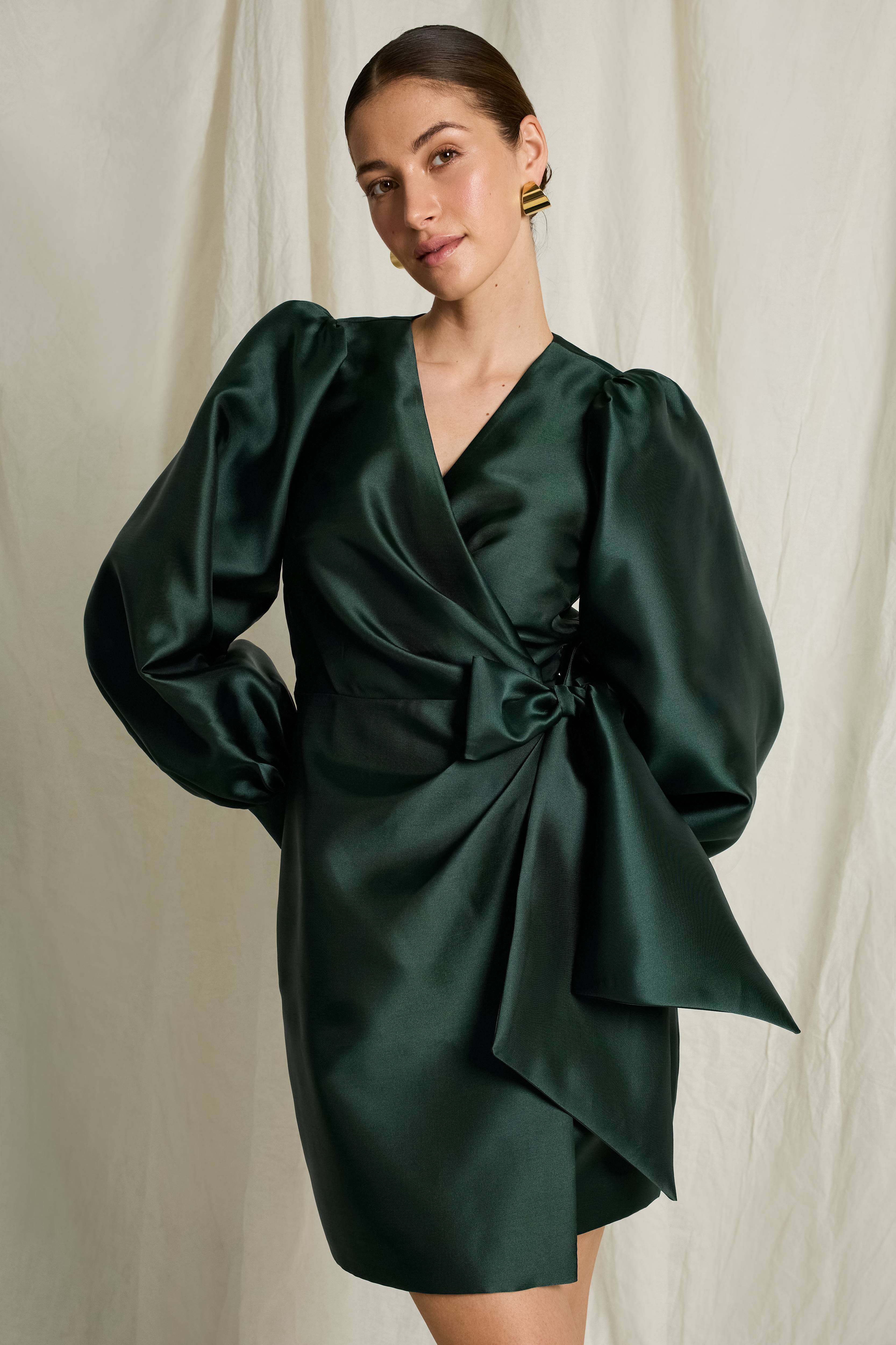 Joelle Kart omslagskjole i sateng med stor sløyfe