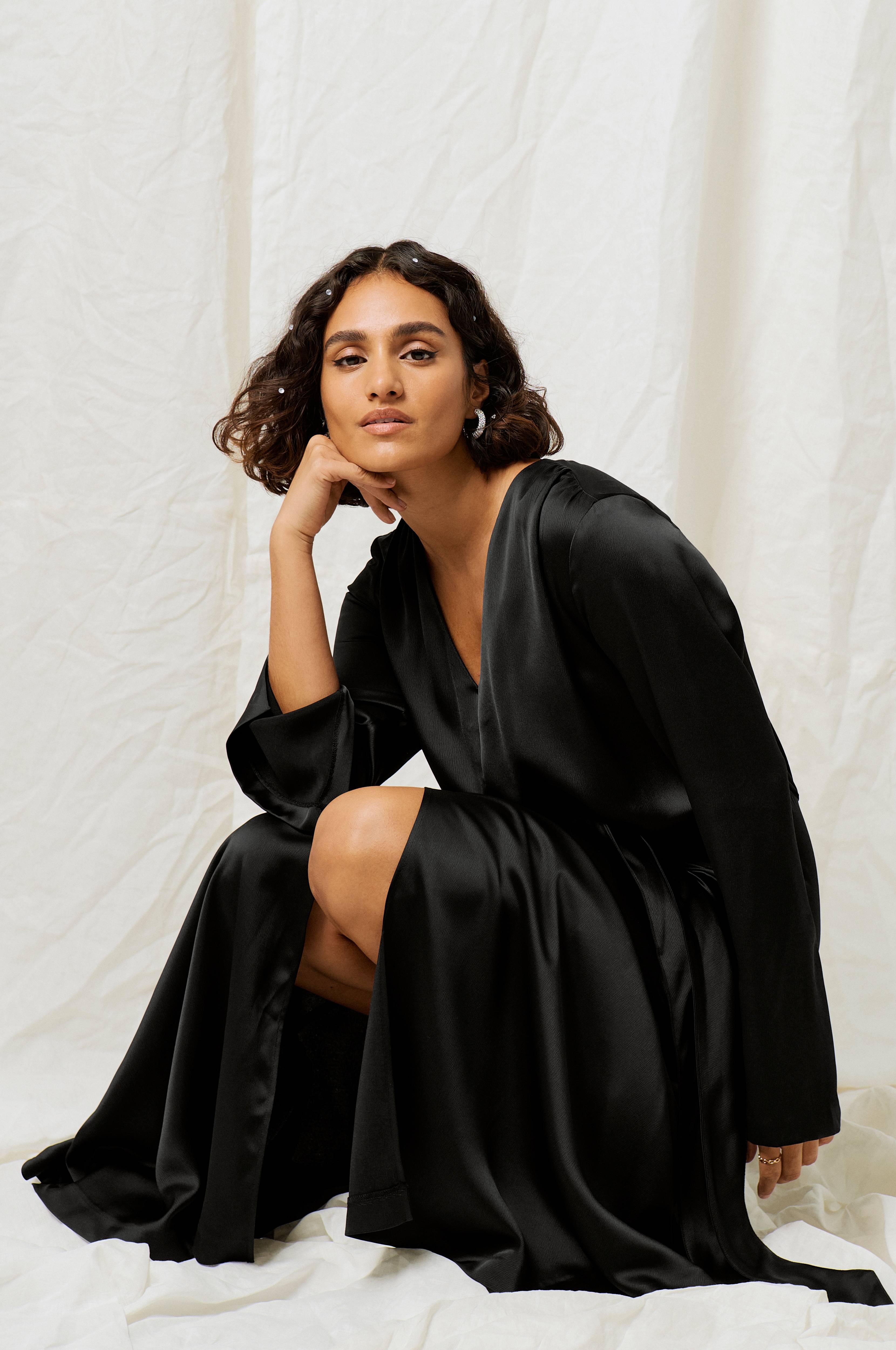 Lang, elegant kjole i sateng. V-utringning og bredt knytebånd fastsydd i sidene. Utsvingt underdel med splitt foran. Rynket søm i ryggen skaper fin drapering. Lengde ca. 143 cm i str 36.