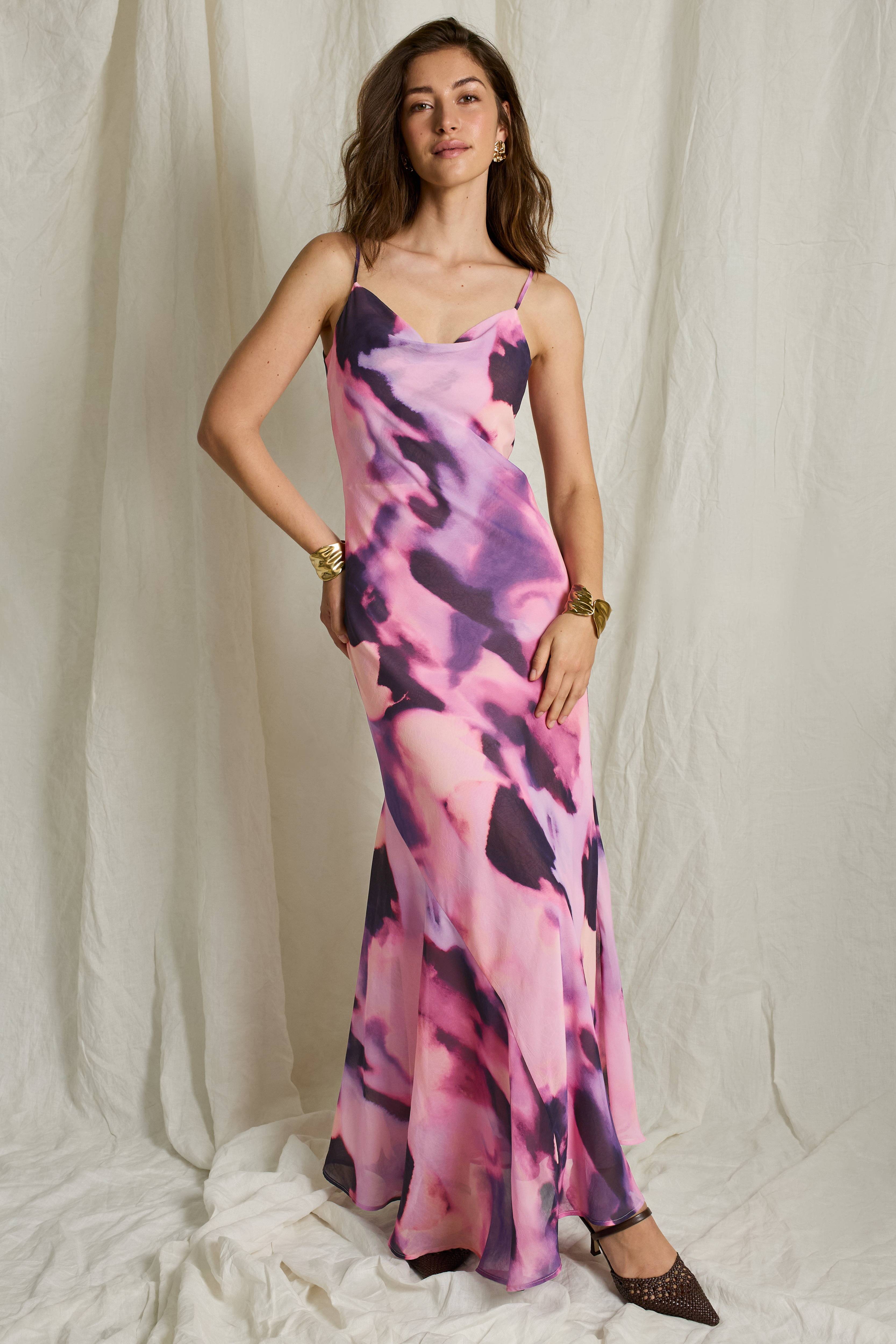 • Lang, ermløs chiffonkjole med tynt innsidefôr