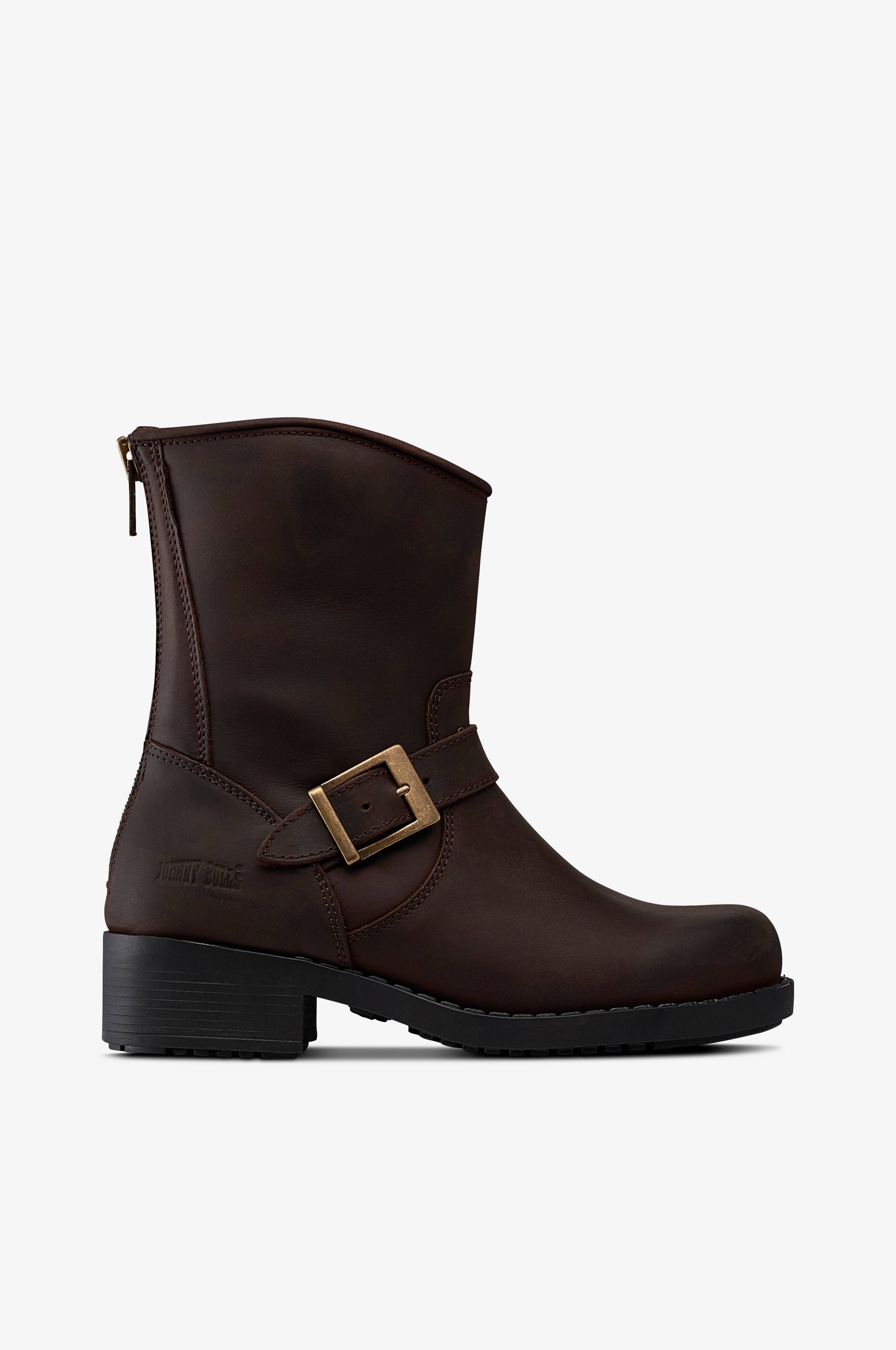 Tøff og solid bikerboots med pent formet skaftekant. Dekorrem med metallspenne over vristen. Glidelås midt bak på skaftet. Den svarte har sølvfarget glidelås og spenne, den brune har gullfarget. Avrundet tå.