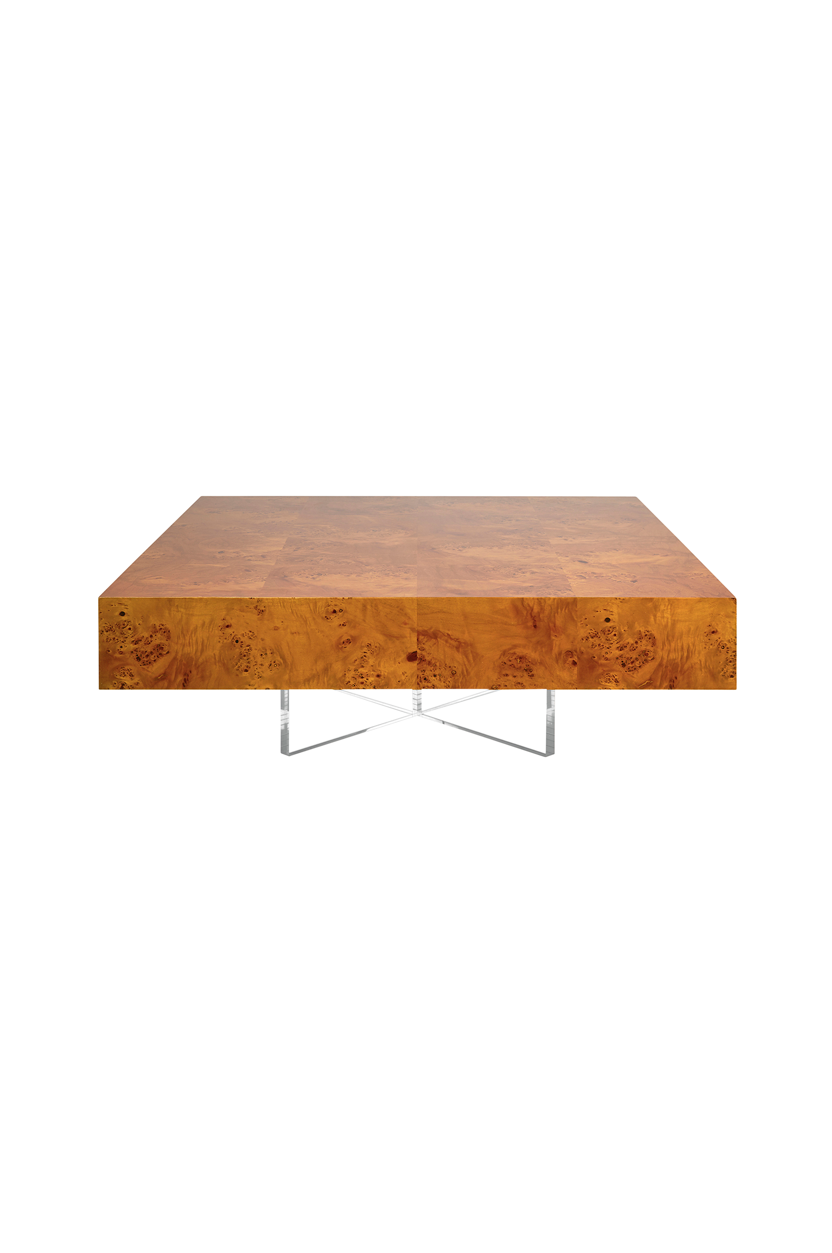 Tidløs eleganse. Arkitektonisk stramhet møter varmen fra tre med årringer i kolleksjonen Bond. Poppeltre på en enkel men glamorøs, X-formet stamme av akryl. Det store og praktfulle, firkantede cocktailbordet Bond måler 102 x 102 cm. Nedtonet nok for et Tribeca-loft, men luksuriøst nok for en loftsleilighet på Park Avenue.