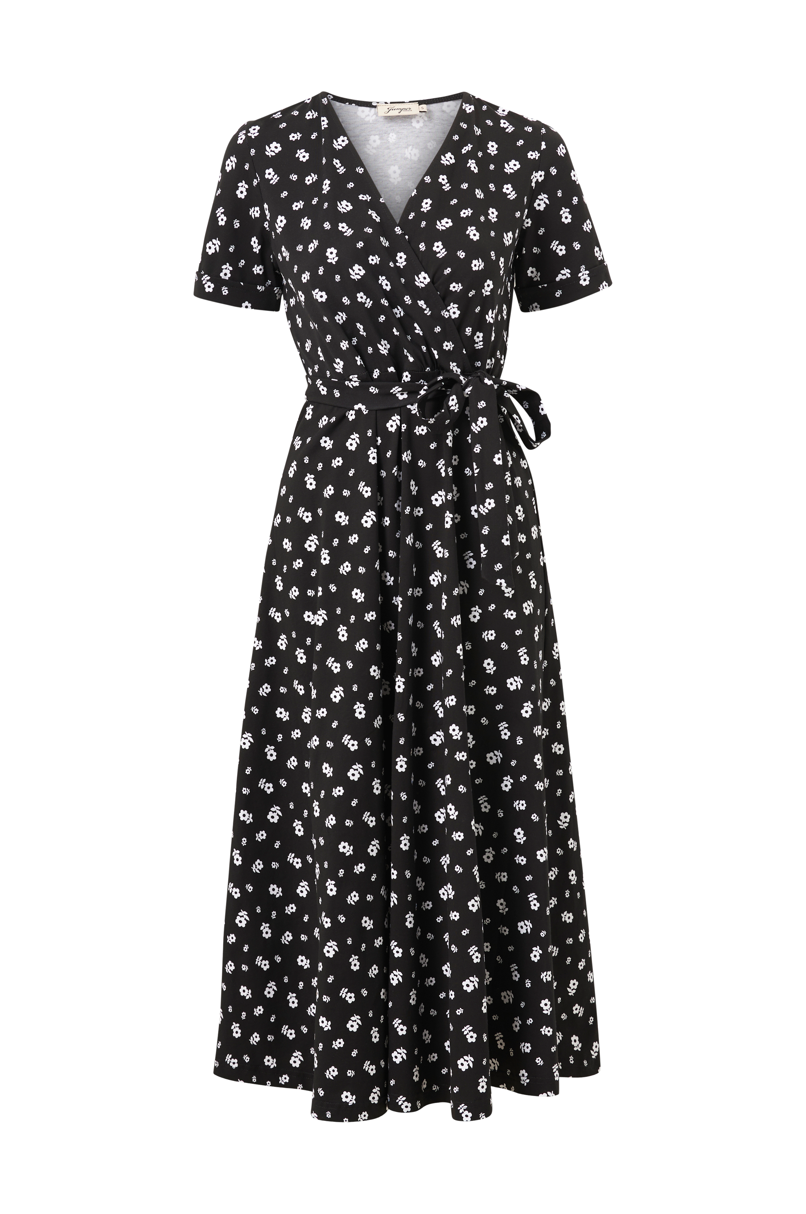 Ankellang kjole i viskoseblanding med blomstret mønster. Omslagsdesign øverst og knytebelte i midjen. Korte ermer med sydd oppbrett. Lengde ca. 123 cm i str S.