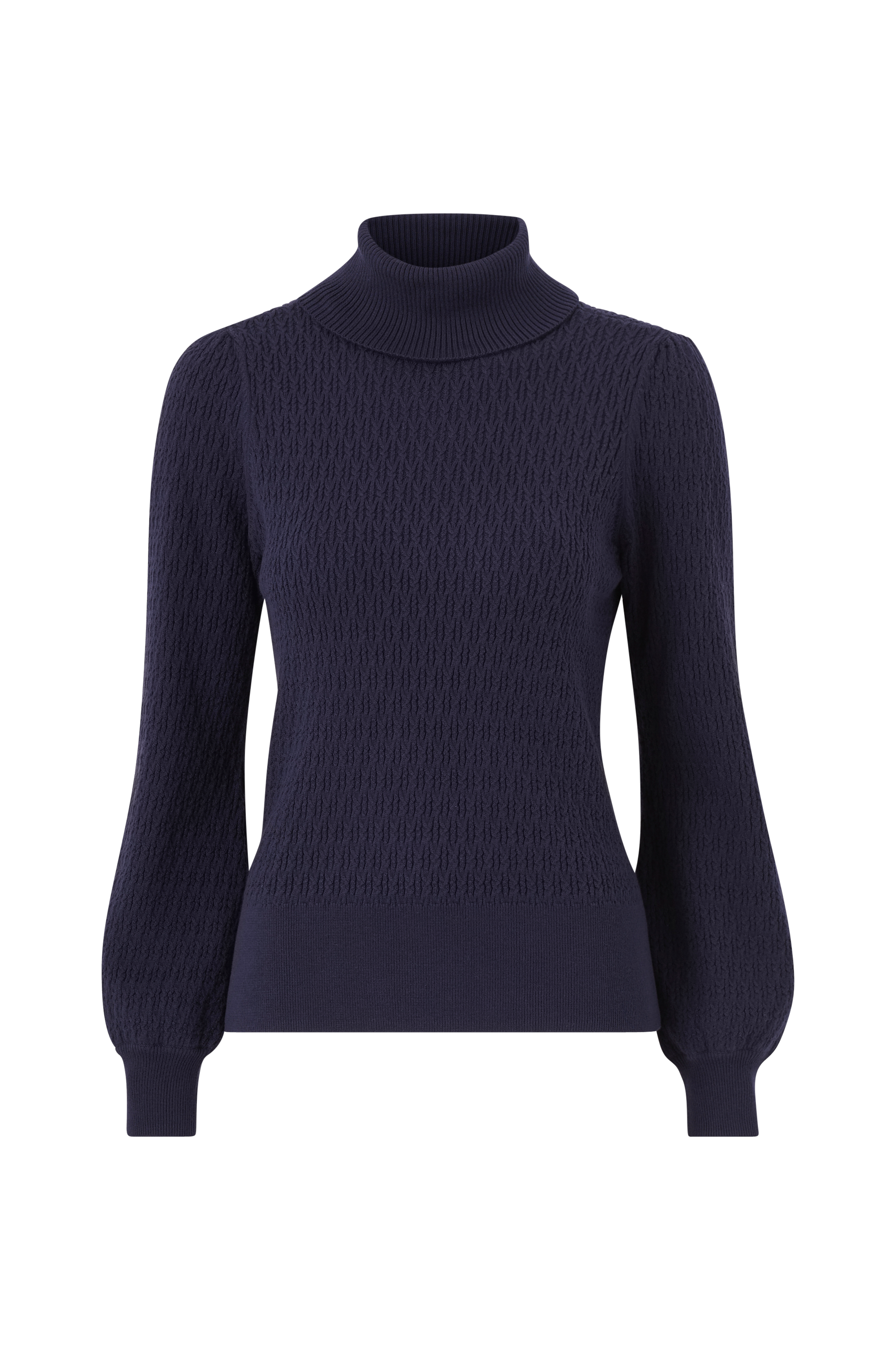 • Strukturmønstret modell• Høy, ribbestrikket krage• Langt erme med rysje ved skulderen• Bred ribbestrikk i ermeslutten og i nedre kant