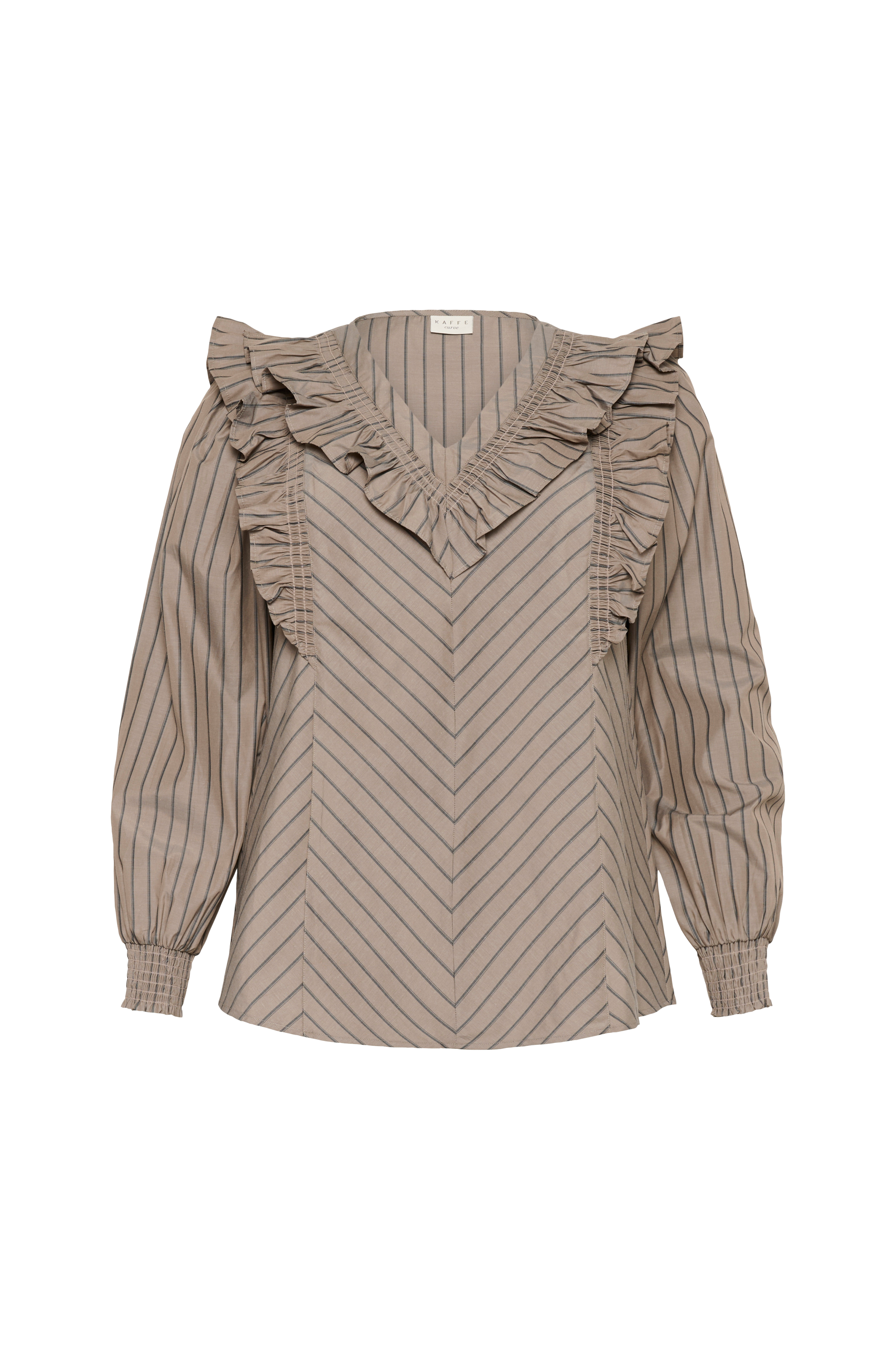 • Plusstørrelser• Rett modell med langsgående sømmer• V-formet hals• Påsydde volanger med elastiske sømmer på brystet og over skuldrene• Langt erme med elastiske sømmer ved armenden