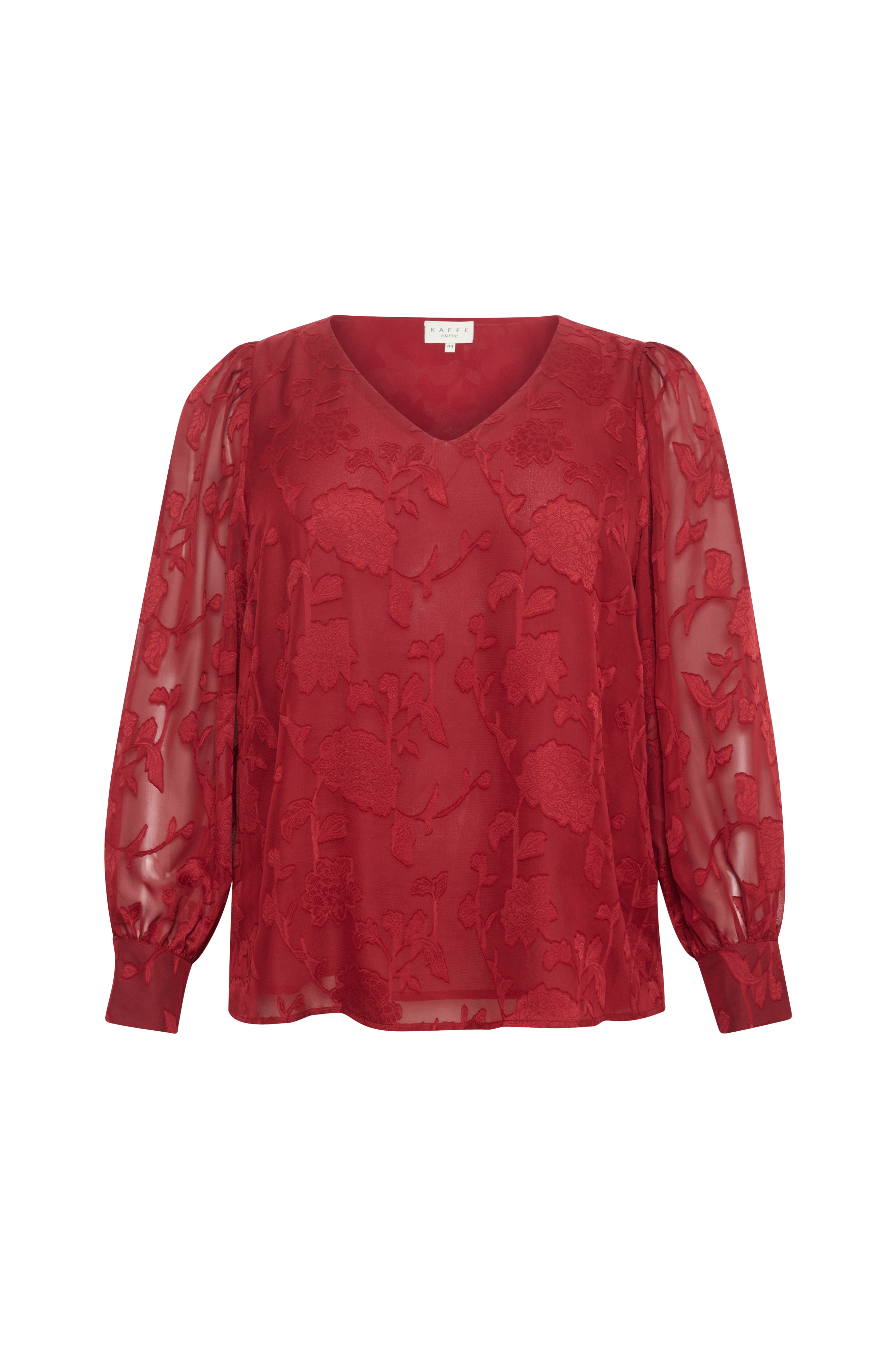 • Bluse i chiffon med jacquardmønster• V-hals• Gjennomsiktige ballongermer med vaffelsøm i ermeslutten• Foring i chiffon• Plusstørrelser