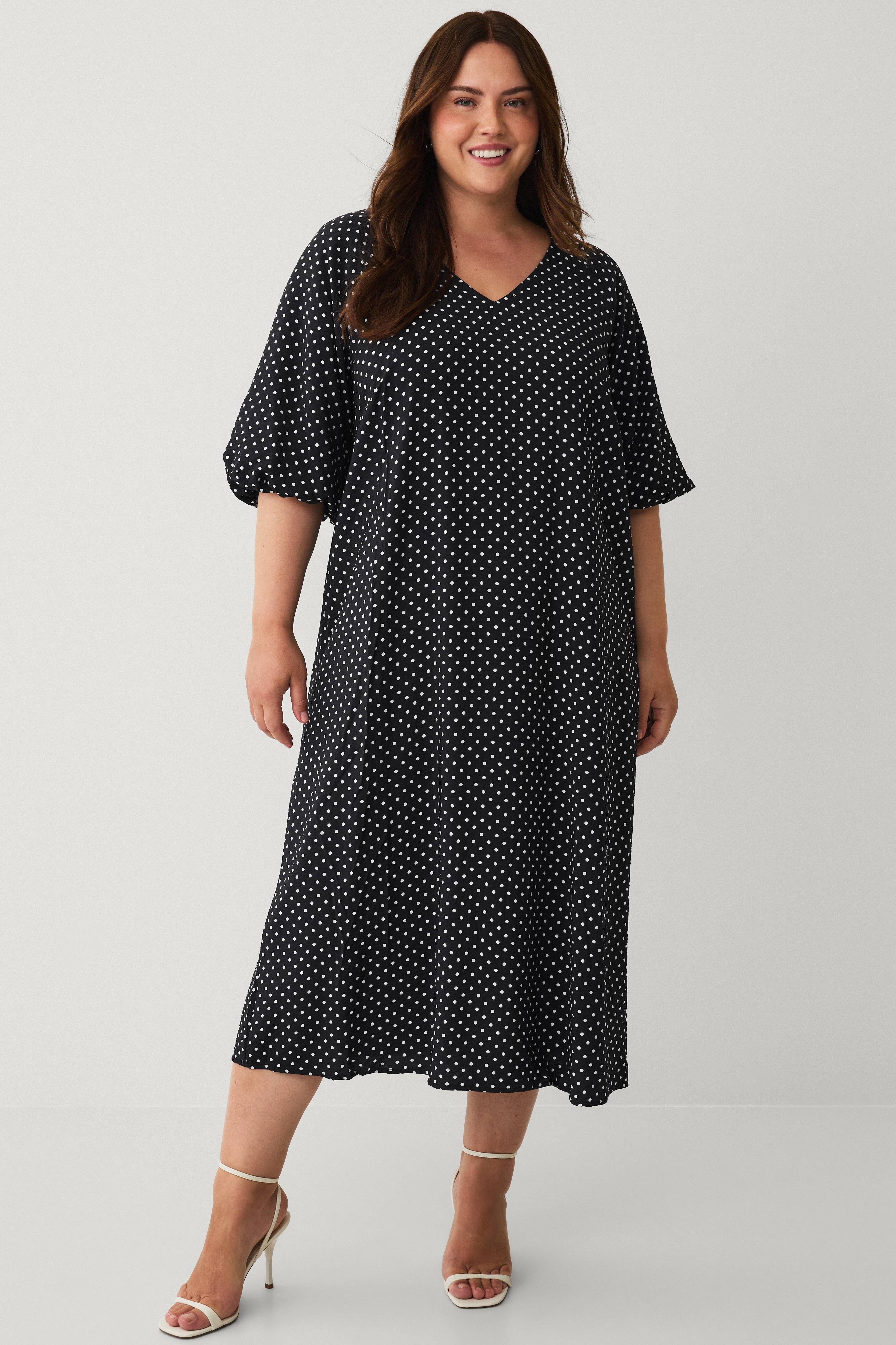 • Kjole i viskosemiks• V-hals• Brede ermer• Luftig design• Pluss-størrelser• Lengde: 124 cm i størrelse 44