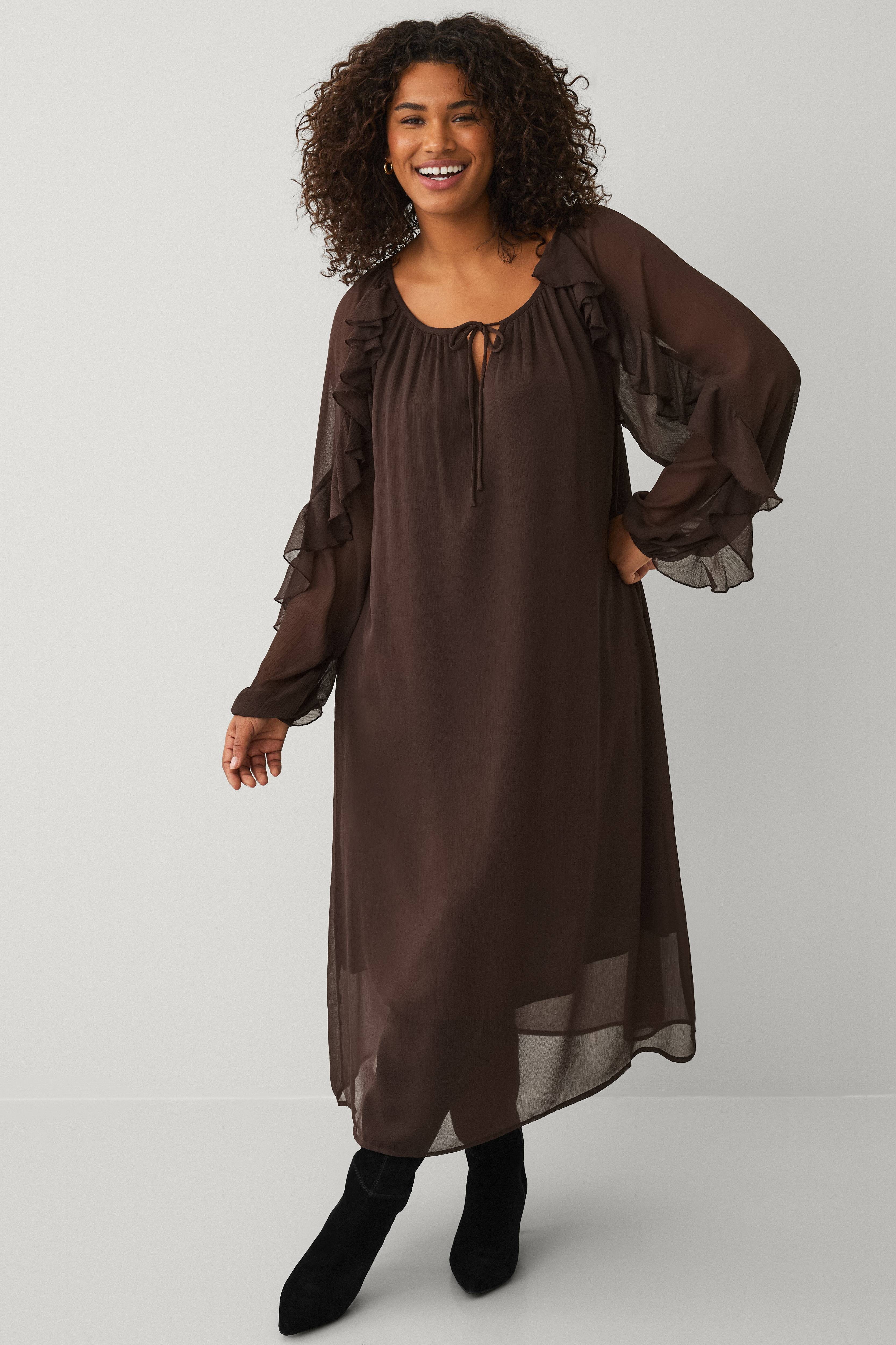 • Lang, fôret kjole i chiffon med avslappet passform• Rund hals med skjær og knutedetalj• Lange, ufôrete ermer med volanger og gummistrikk i ermeslutten• Pluss-størrelser• Lengde: 128 cm i størrelse 44