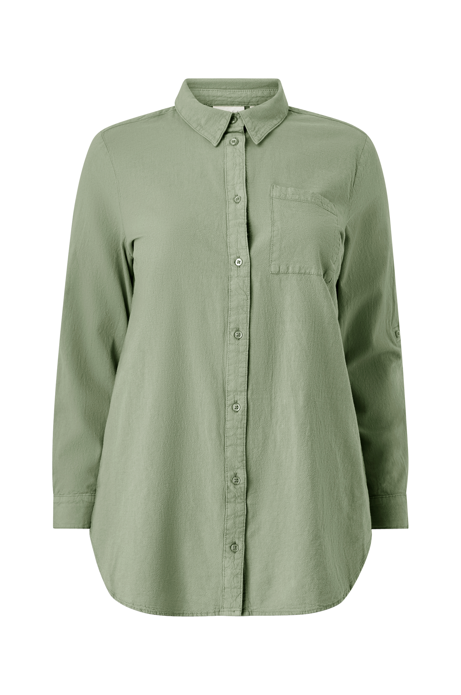 • Knapper foran• En brystlomme• Lange ermer med knapp for opprulling• Avrundet hem• Plusstørrelser
