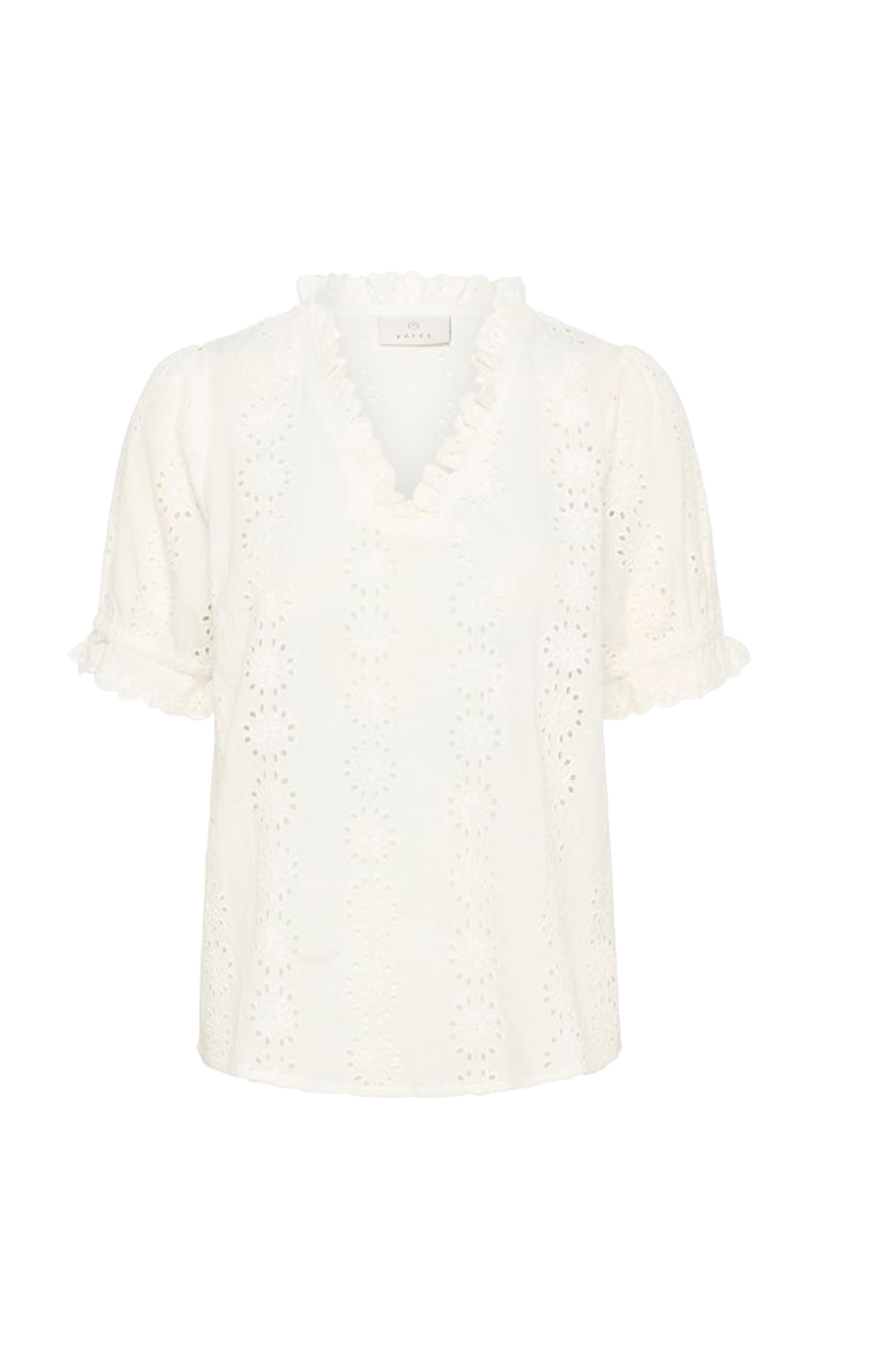 • Bluse med brodert hullmønster• V-hals snitt med volang• Korte bobleermer med volang