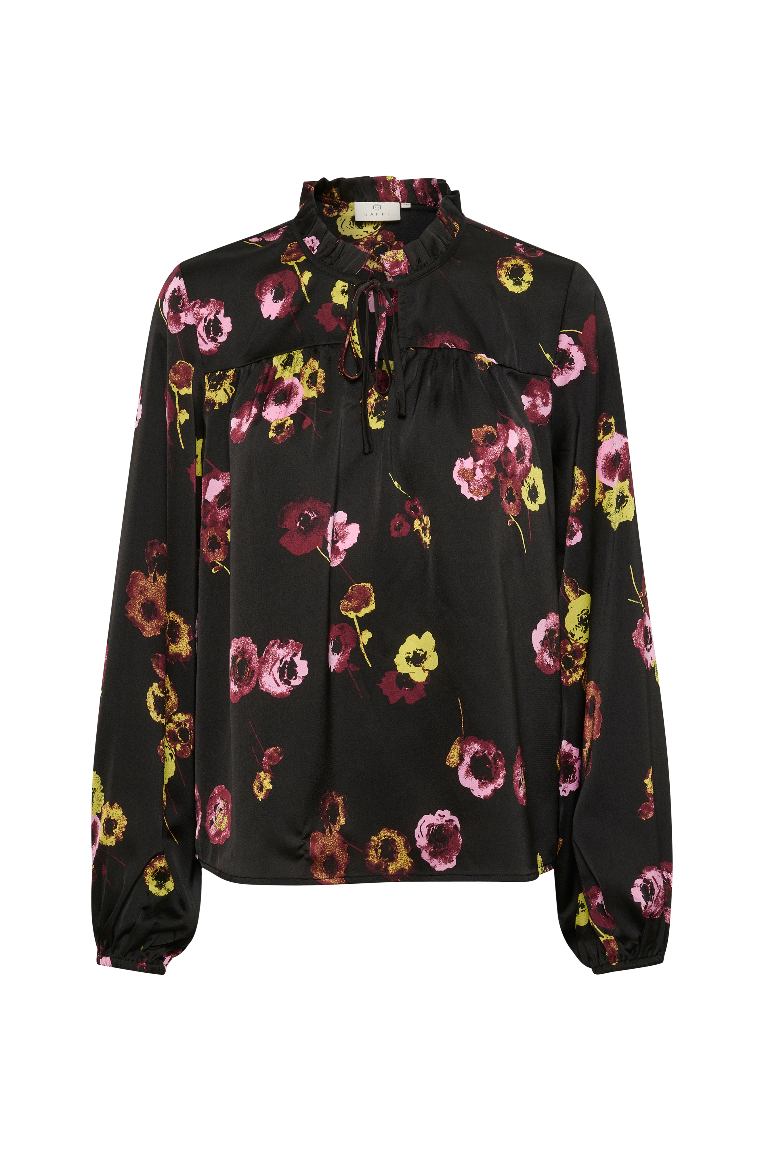 Bluse med trykt blomstermønster. Rund hals med volangkant. Splitt foran med knytebånd. Rynkede detaljer øverst foran. Lange, vide ermer med strikk i ermekantene.