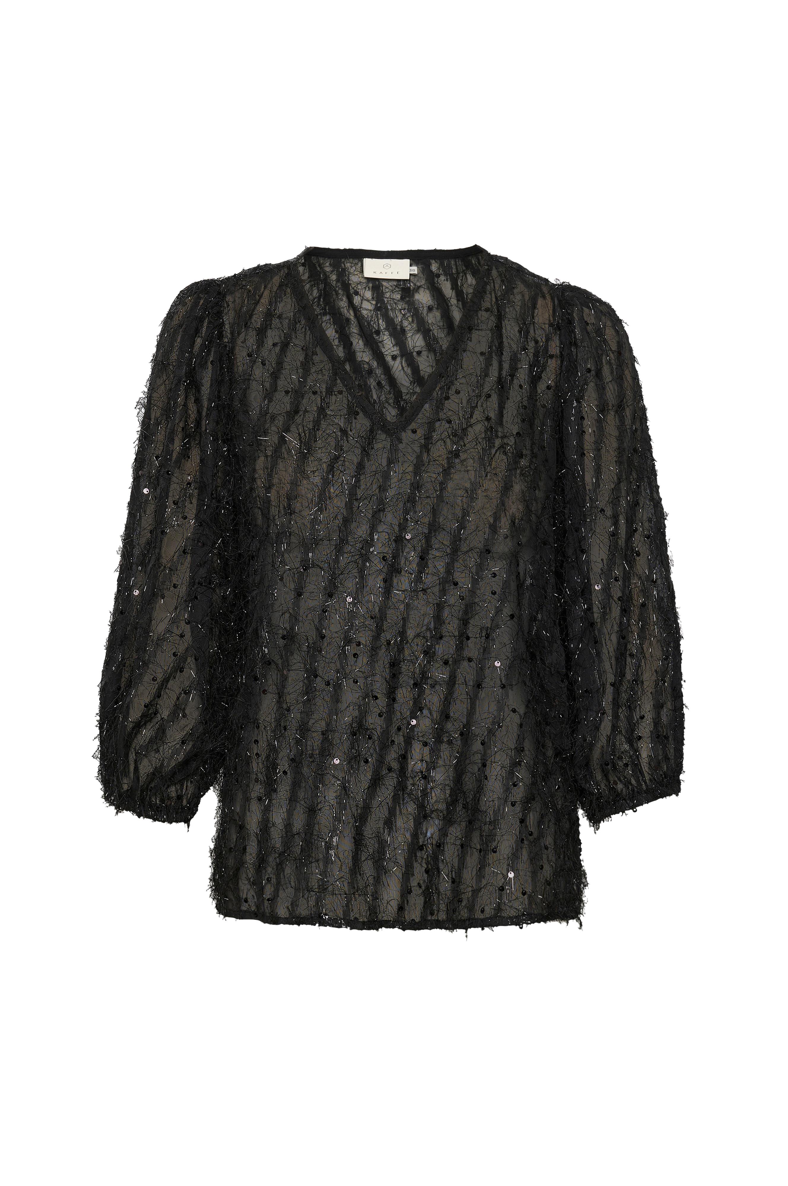• V-hals snitt• Ballongermer 3/4 lang med elastiske mansjetter• Gjennomsiktig kvalitet med frynser og paljetter