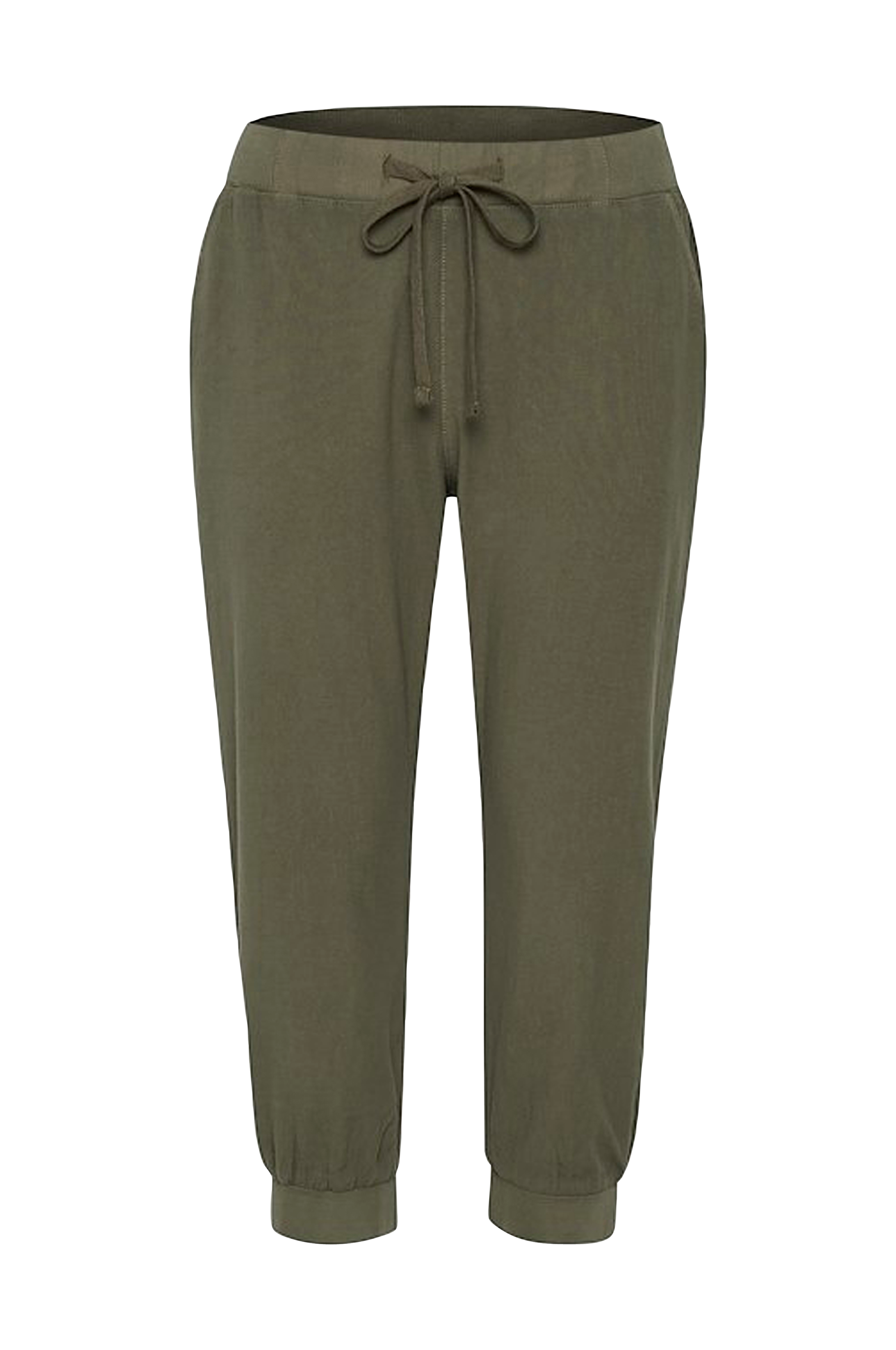 Modell med ledig snitt og rette ben som slutter på leggen med ribbestrikket kant nederst. Ribbestrikket linning med innfelt strikk og snor, samt to skrålommer foran. Indre benlengde ca. 57 cm i str 36.