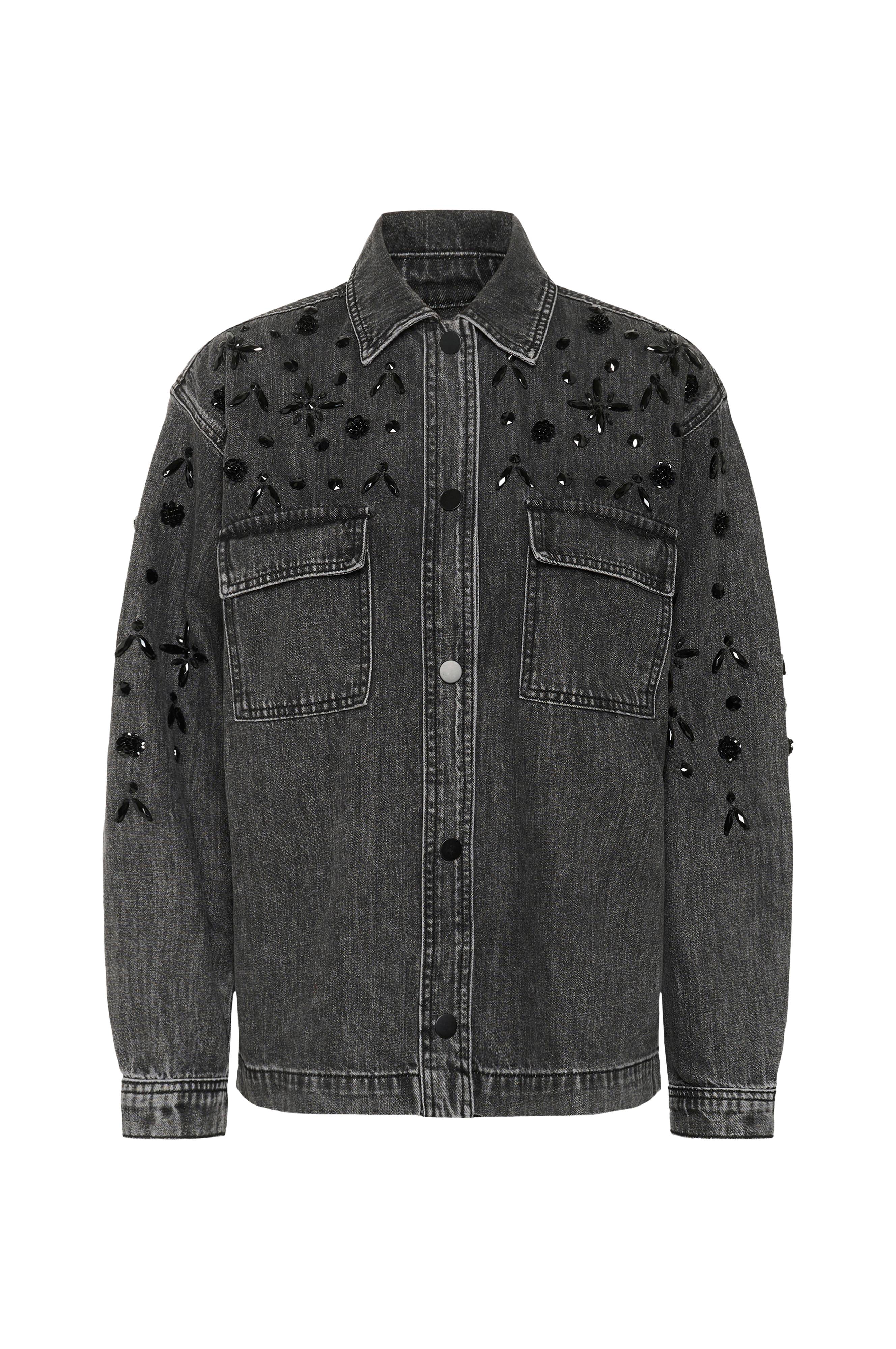 • Jakke i denim med klassisk krage• Dekorative stifter på toppen• Lange ermer med mansjett med trykknapp• Knappstolpe med trykknapper hele veien fram• Brystlommer med lokk• Lengde: 69 cm i størrelse 36