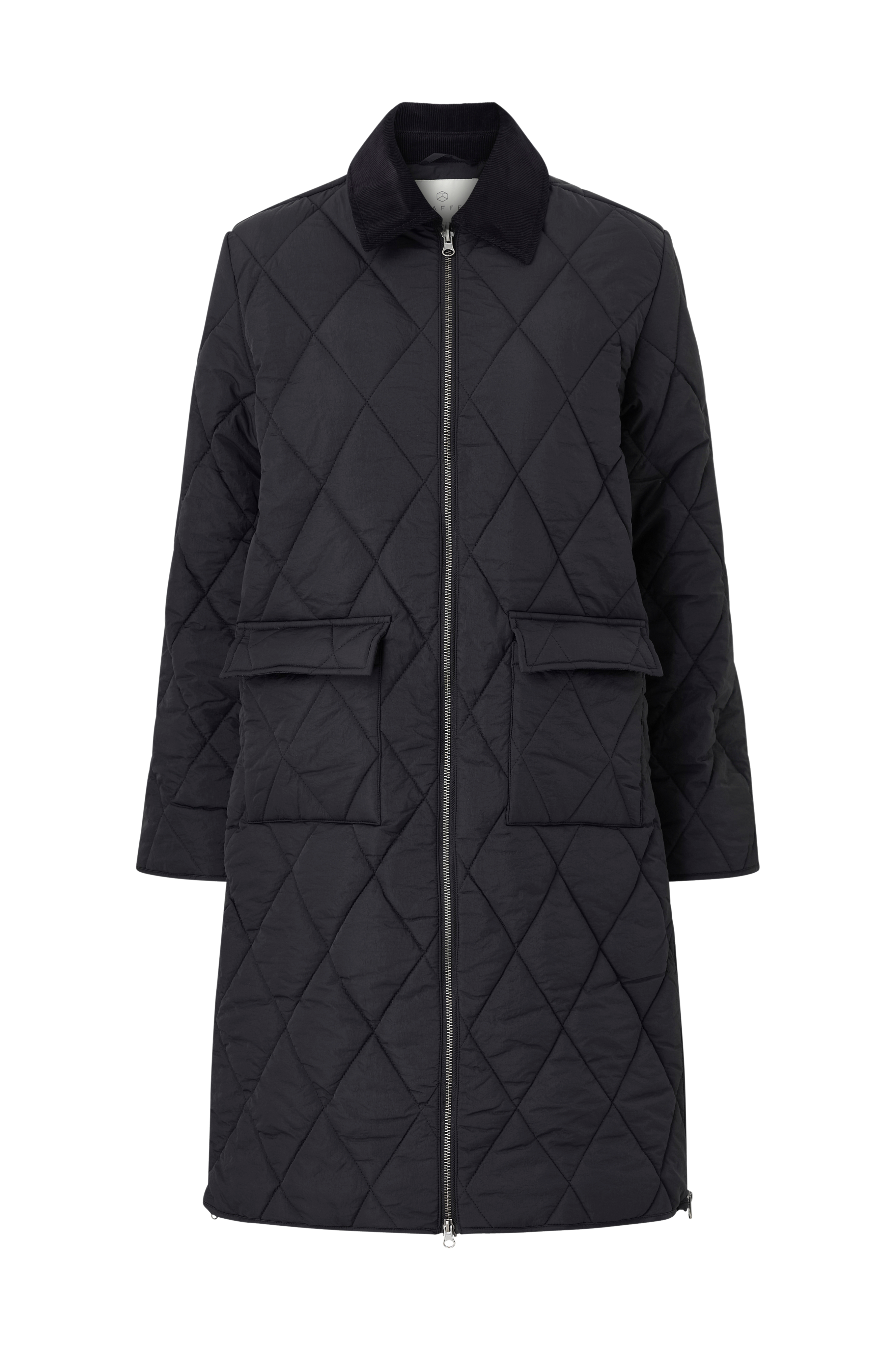 • Lett polstret, vattert jakke med krage i cord• To-veis glidelås• Glidelåslukking i sidene og på bunnen• To lommer foran med lokk• Lengde: 106 cm i størrelse 36