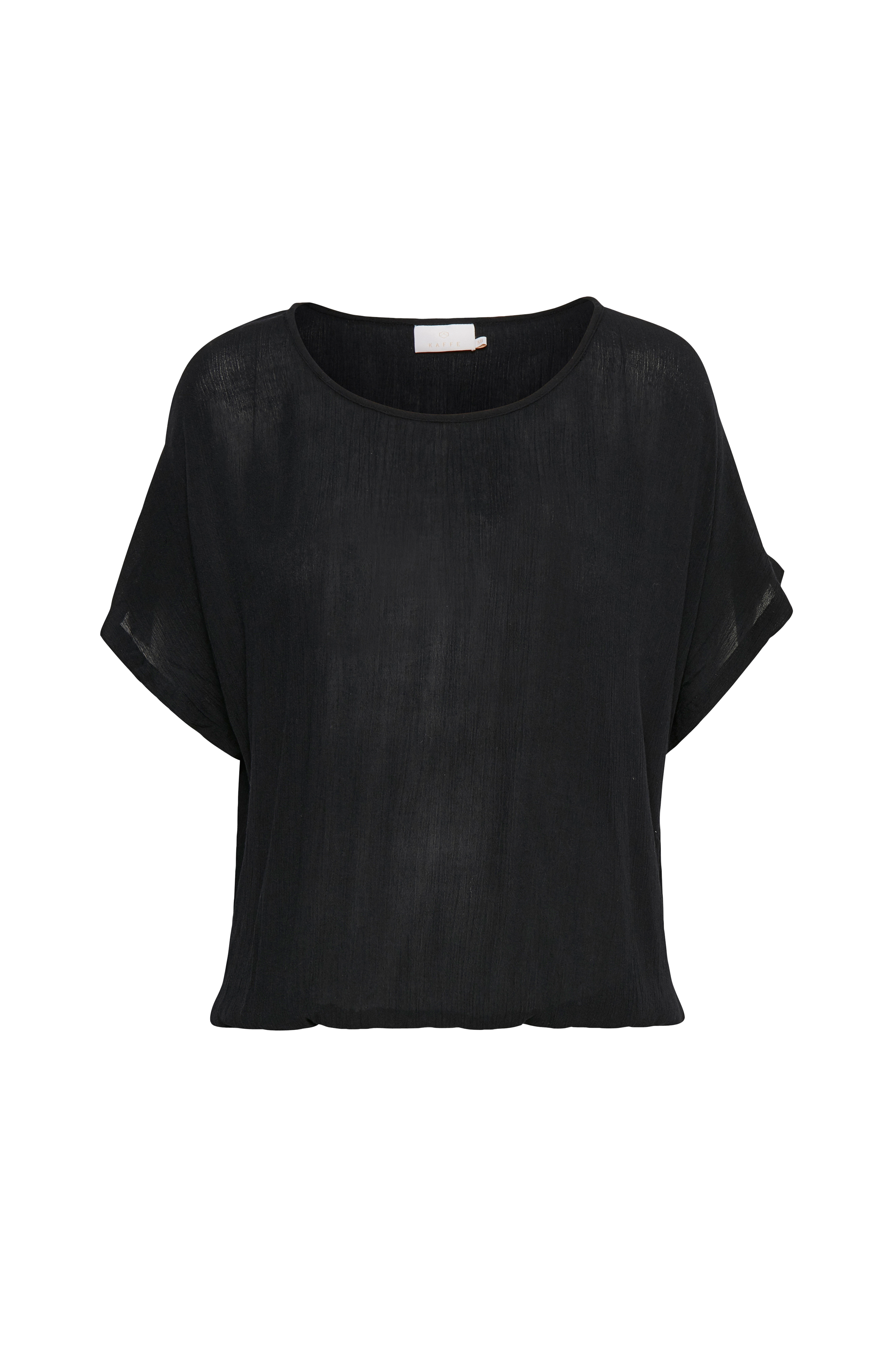 Rett modell med ledig snitt, lave skuldersømmer og korte ermer. Rund hals med smal, påsydd kant samt innfelt strikk i nederkanten.