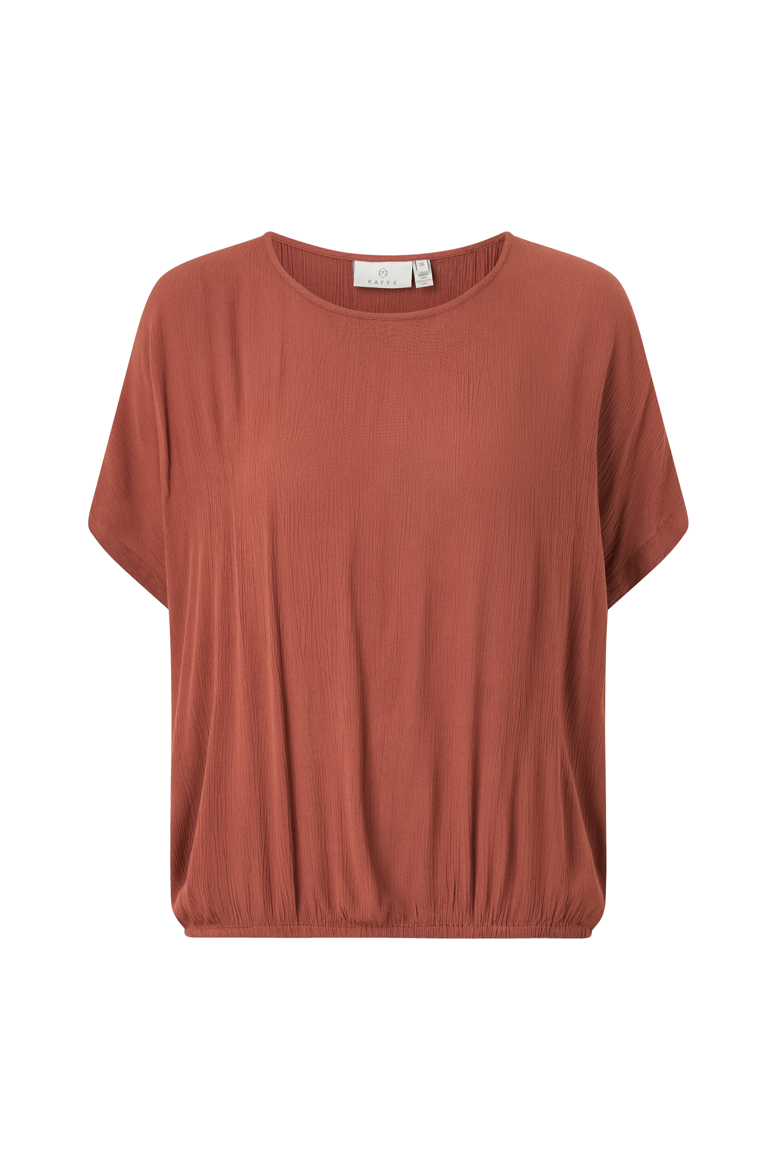 Rett modell med ledig snitt, lave skuldersømmer og korte ermer. Rund hals med smal, påsydd kant samt innfelt strikk i nederkanten.