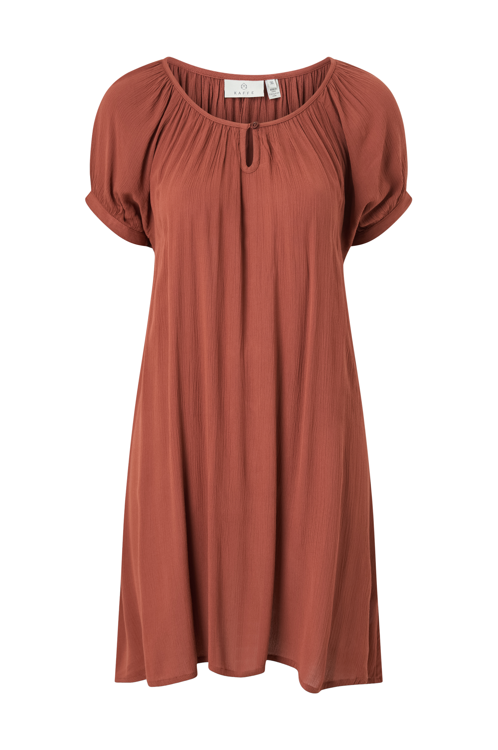 Tunika Amber SS Tunic fra Kaffe i tynn, vevd kvalitet med krinklet struktur og fint fall. Korte ermer med smal mansjett og knapp. Liten åpning med knapp foran i halsringningen. Lengde ca. 86 cm i str 36.