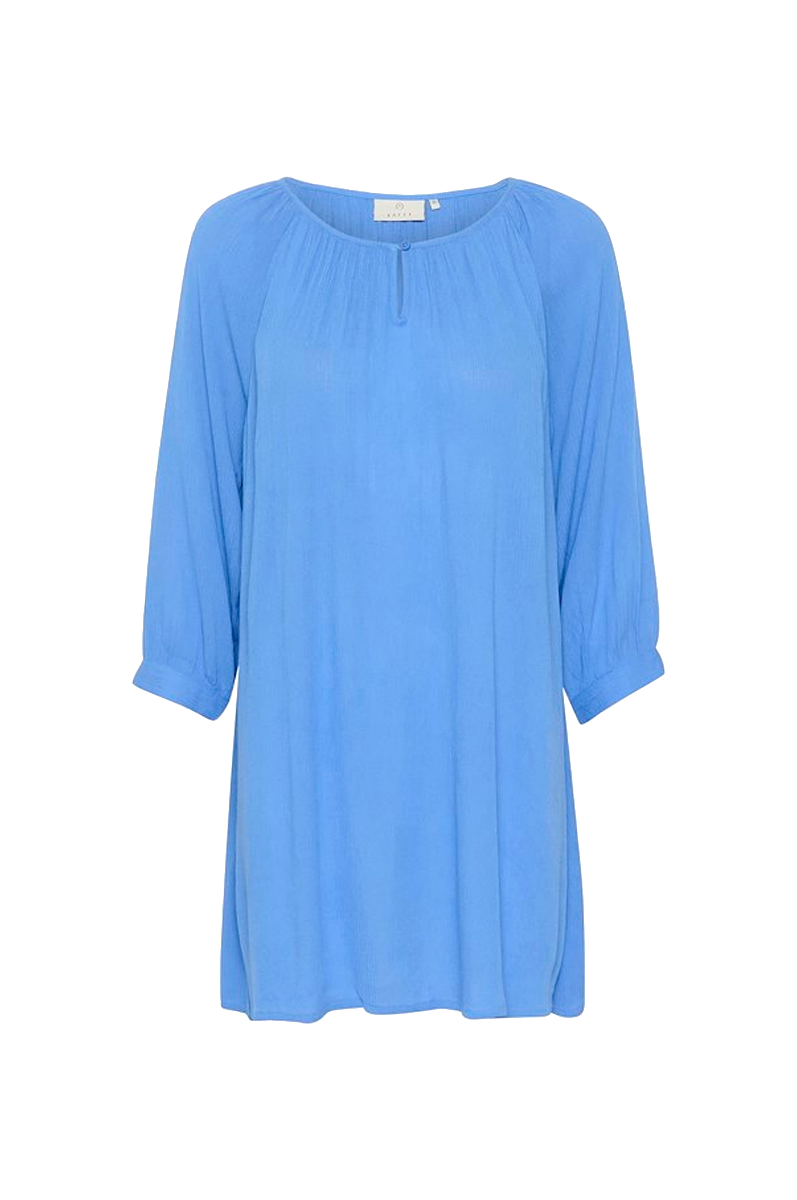 Tunika Amber Tunic fra Kaffe i ledig A-linjemodell med vide, 3/4-lange ermer med mansjett og knapp i ermekantene. Rund hals med splitt og knapp foran. Framstilt i vevd, krinklet kvalitet. Lengde ca. 89 cm i str 36.