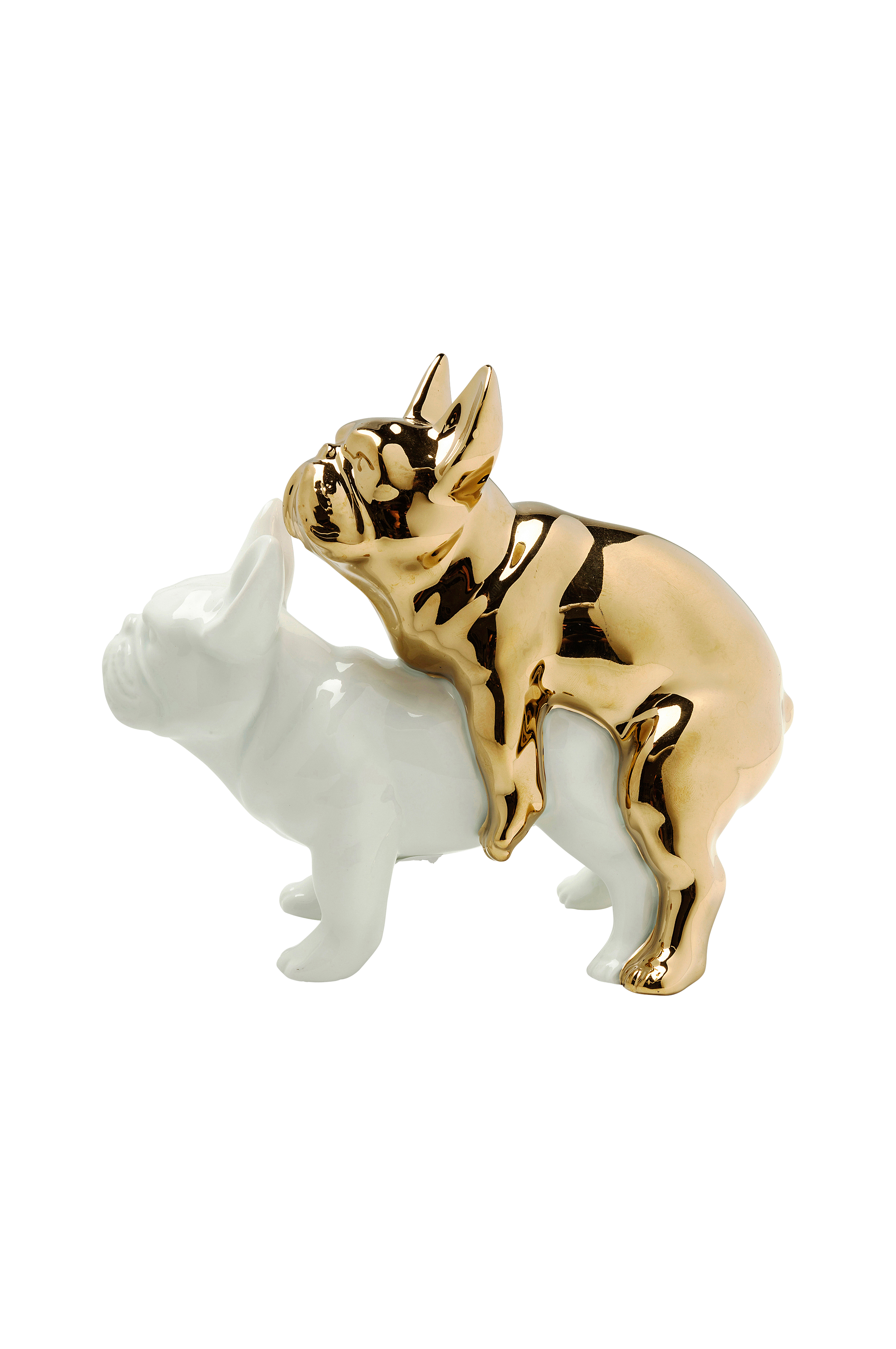 Denne uvanlige porselensfiguren med to kjærlige - eller leker de bare? -dogs er noe for eiere uten hemninger. De to firbeinte vennene danner bokstavelig talt en enhet og er utmerket utformet. Det hvite og gullet danner en stilig kontrast og passer inn i nesten ethvert interiør. Plasser denne flamboyante pyntegjenstanden i vinduskarmen, på en kommode eller i et vitrineskap.