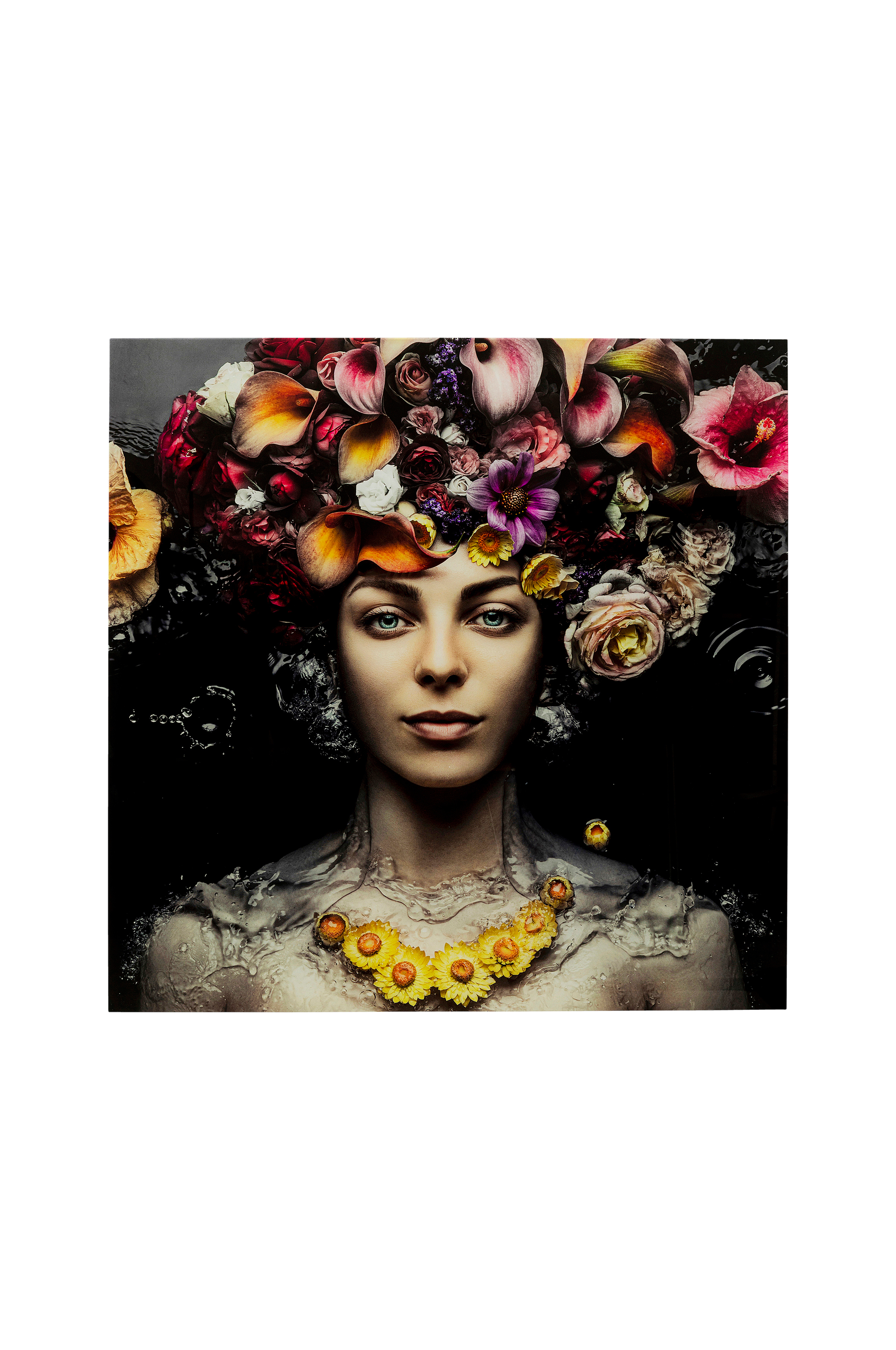 Fotokunst til å bli forelsket i. Blomster i massevis og en fortryllende blomstergudinne. Vekker drømmer om midtsommer, som en blomsterbukett fra en enestående blomsterhandler. Stilrent og moderne bilde, trykt på glass, uten ramme.