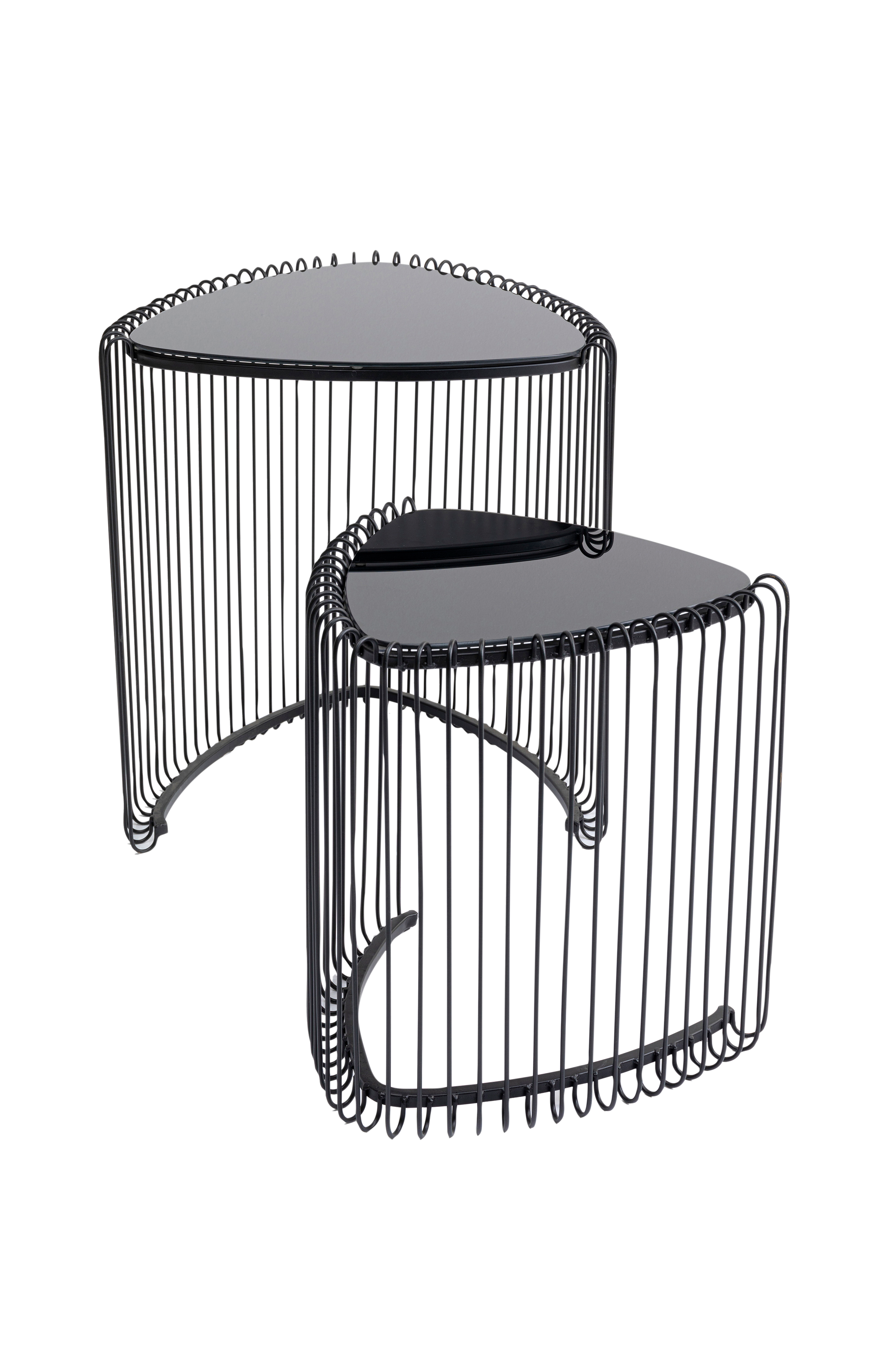 For alle med sans for ren design: dette grafiske sidebordet i et sett med to bord tar minimalistisk design til det ytterste, og har en heftig stil. En bordplate av glass hviler på en elegant trekantet ramme med smale metallstenger. En moderne og smart design som gir en lett og luftig følelse, til tross for sitt imponerende utseende. De to bordene kan flyttes rundt i hjemmet, og stå sammen eller hver for seg. De kan for eksempel brukes som nattbord, sofabord eller lite entrebord. Sofabordene er også fine når de er skjøvet sammen. De er et fint tilskudd i enhver minimalistisk, moderne innredning. Mål: Stort bord: 43,5x47, høyde 50 cm. Lite bord: 35x38,5, høyde 41 cm.