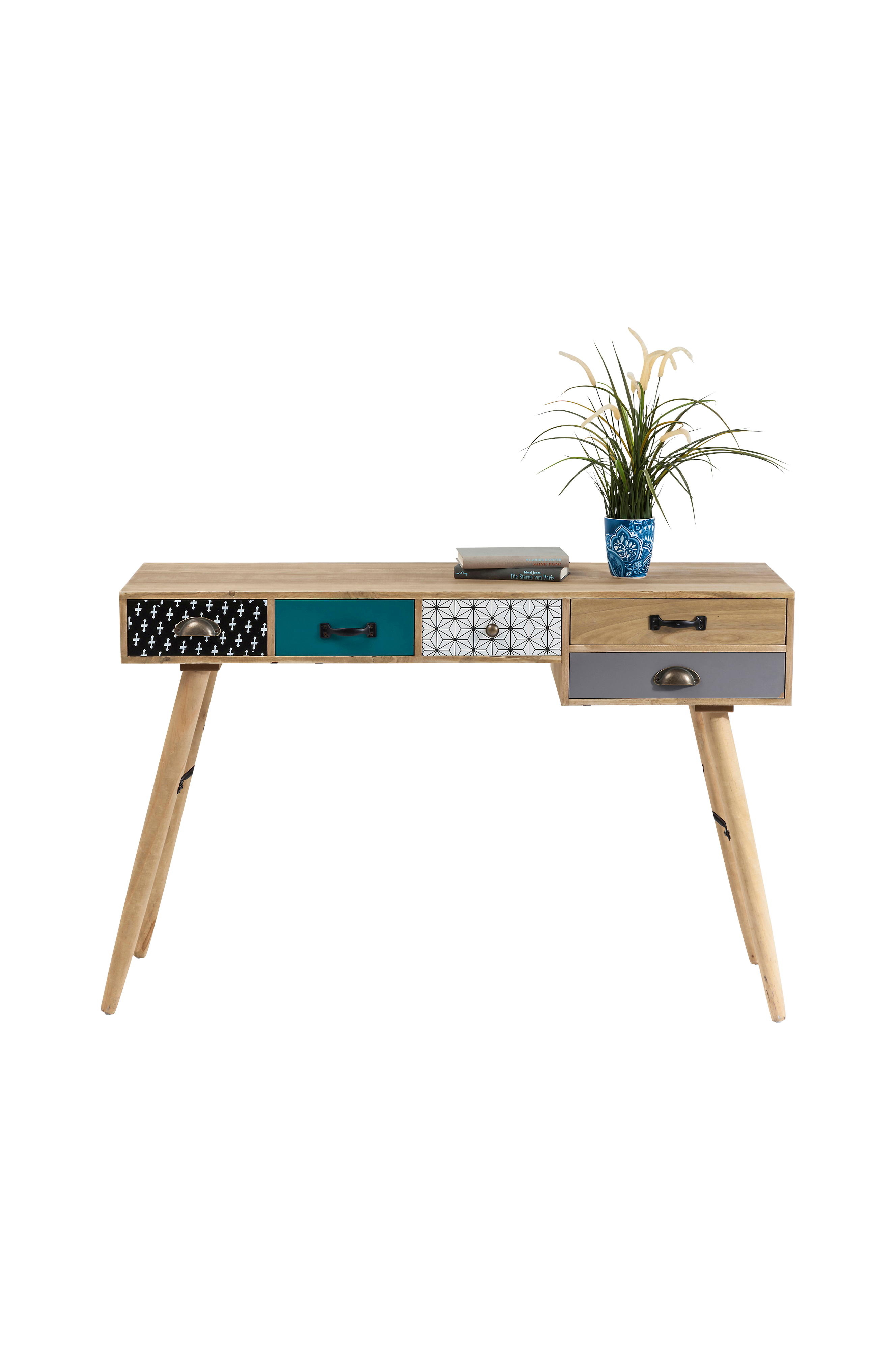 Capri skrivebord imponerer med en sjarmerende kombinasjon av grafiske mønstre, ulike farger og stiler. For deg som liker retro og det ukonvensjonelle. Fem skuffer. Ben av massiv paulownia-tre og bordplate av MDF. Leveres umontert.