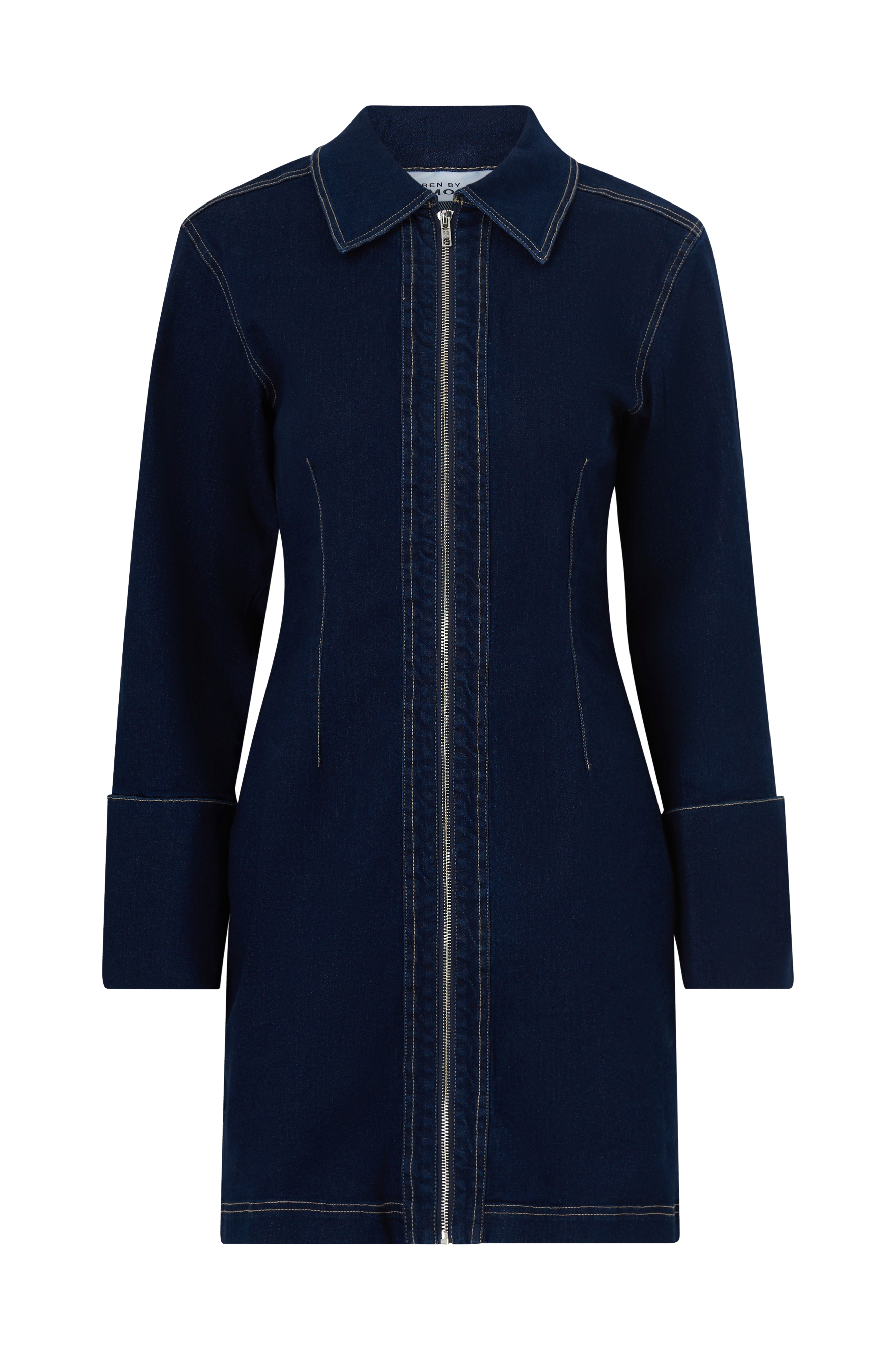 • Lett figurformet modell i denim med dekorstrikkede sømmer• Stor krage• Glidelås hele veien fram• Utsvingt, ekstra langt erme med brede opprullede ermer og trykknapper i ermeslutten• Lengde: 89 cm i størrelse 36