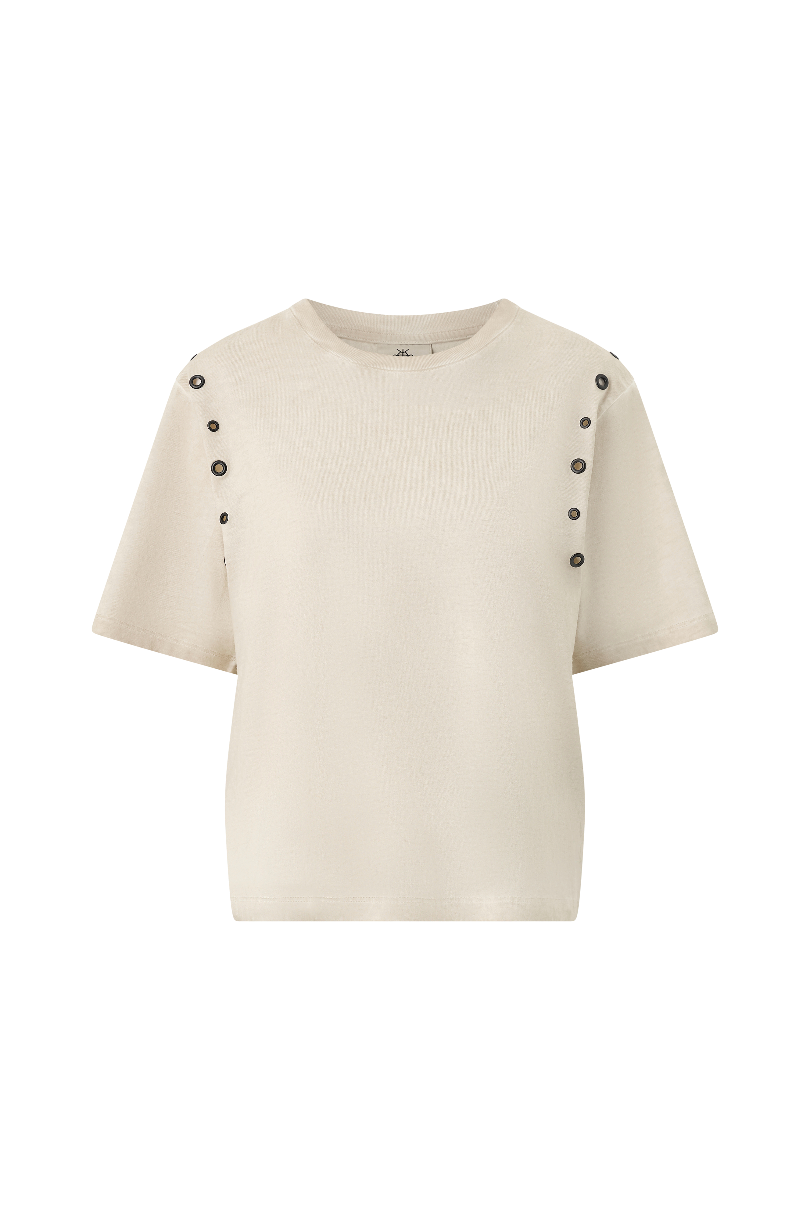 • Myk, stenvasket t-skjorte i bomull• Runde stifter rundt skuldrene• Rund, ribbet hals