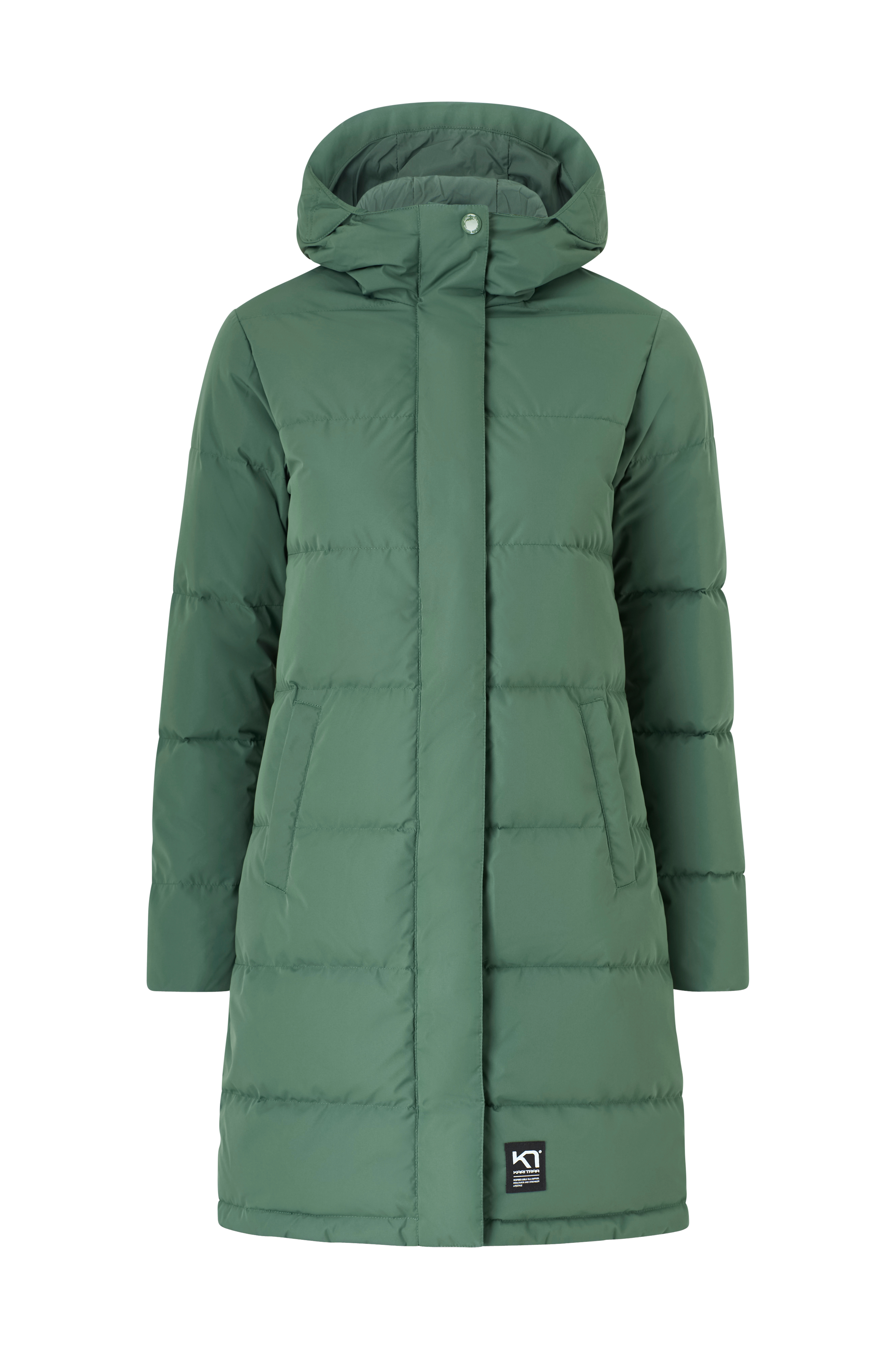 • Lang dun jakke med avslappet passform • Fast hette med myk foring i fløyel • Høy krage • Toveis YKK-glidelås • Klafflomme over glidelåsen med trykknapper • To lommer med trykknappslukning • Stretchy tricot mansjettknapper i ermeslutten • Lengde: 84 cm i størrelse S