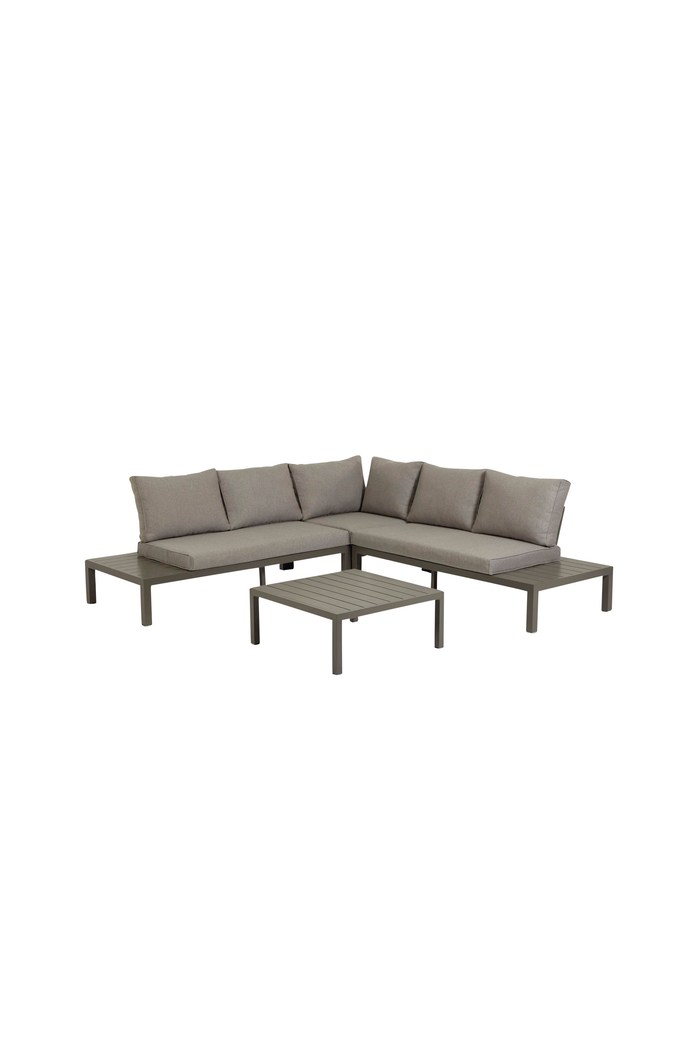 Modular hjørnesofa 5-seter og bord av brunt aluminium. Vendbare puter inkludert. Mål: Bord 80 x 80, høyde 34 cm. Sofa 246 x 246, høyde 65 cm. Sofadelen avsluttes med to bord 35 x 80 cm. Til utendørs bruk. Leveres umontert.