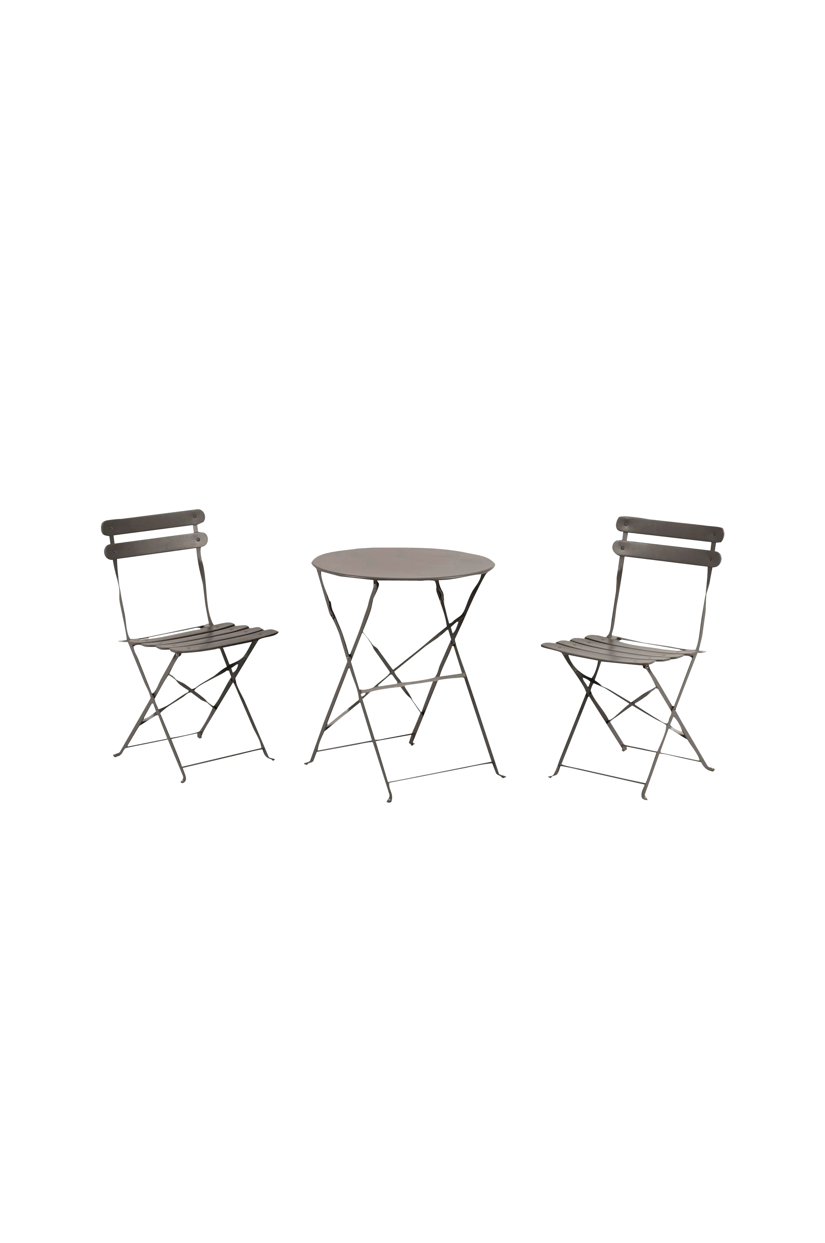 Mindre steder, som balkongen, ser innbydende ut med dette metallbordet og de to stolene. De er også rustbestandige og fellbare for å ikke ta opp plass når de ikke er i bruk. Mål: bord diameter 60 cm, høyde 71 cm. Stol bredde 42 cm, dybde 48 cm, høyde 82 cm