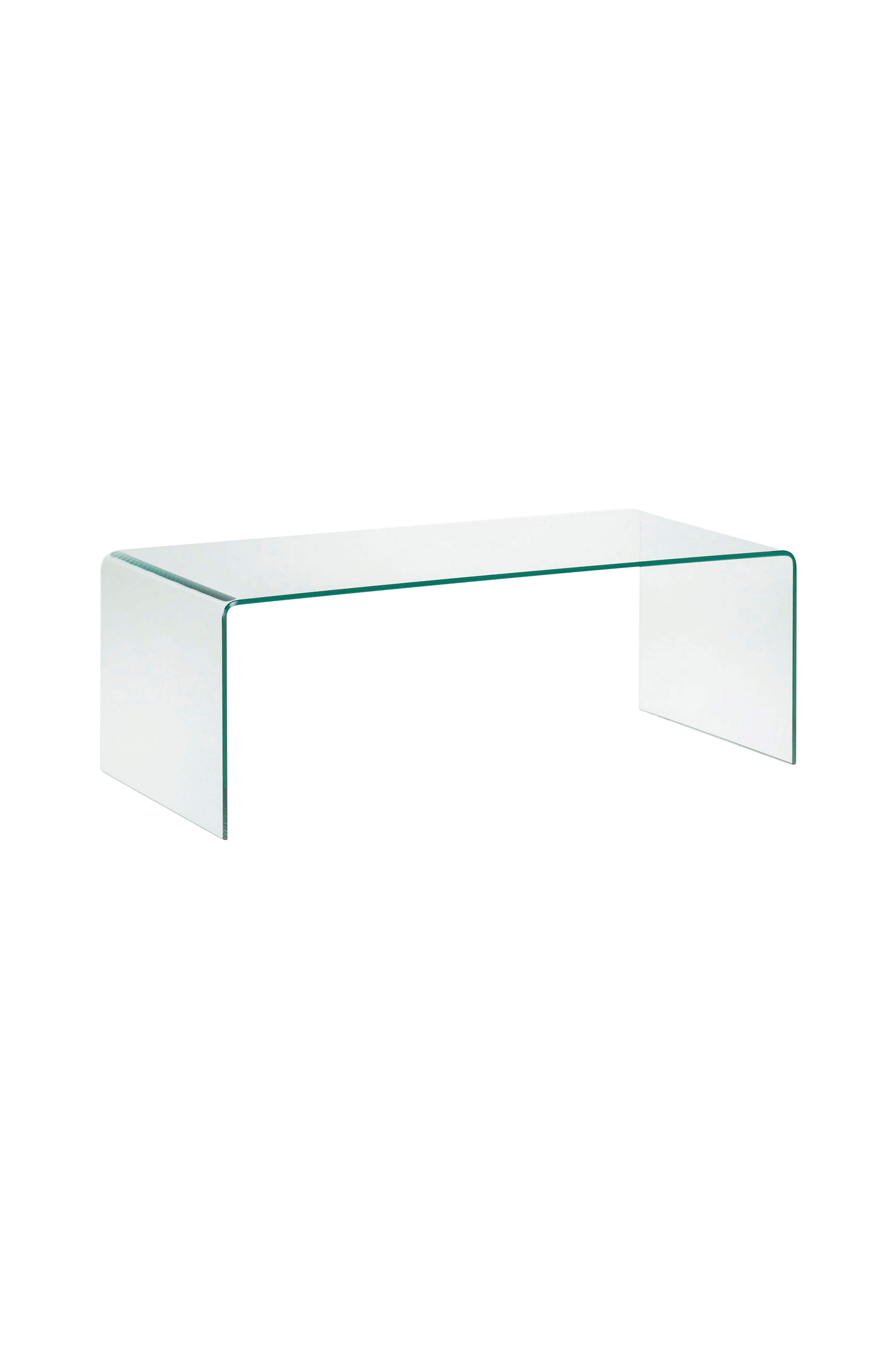 Sofabord av transparent, herdet glass. Glassets tykkelse 10 mm. Bredde: 110 cm. Dybde: 50 cm. Høyde: 38 cm.