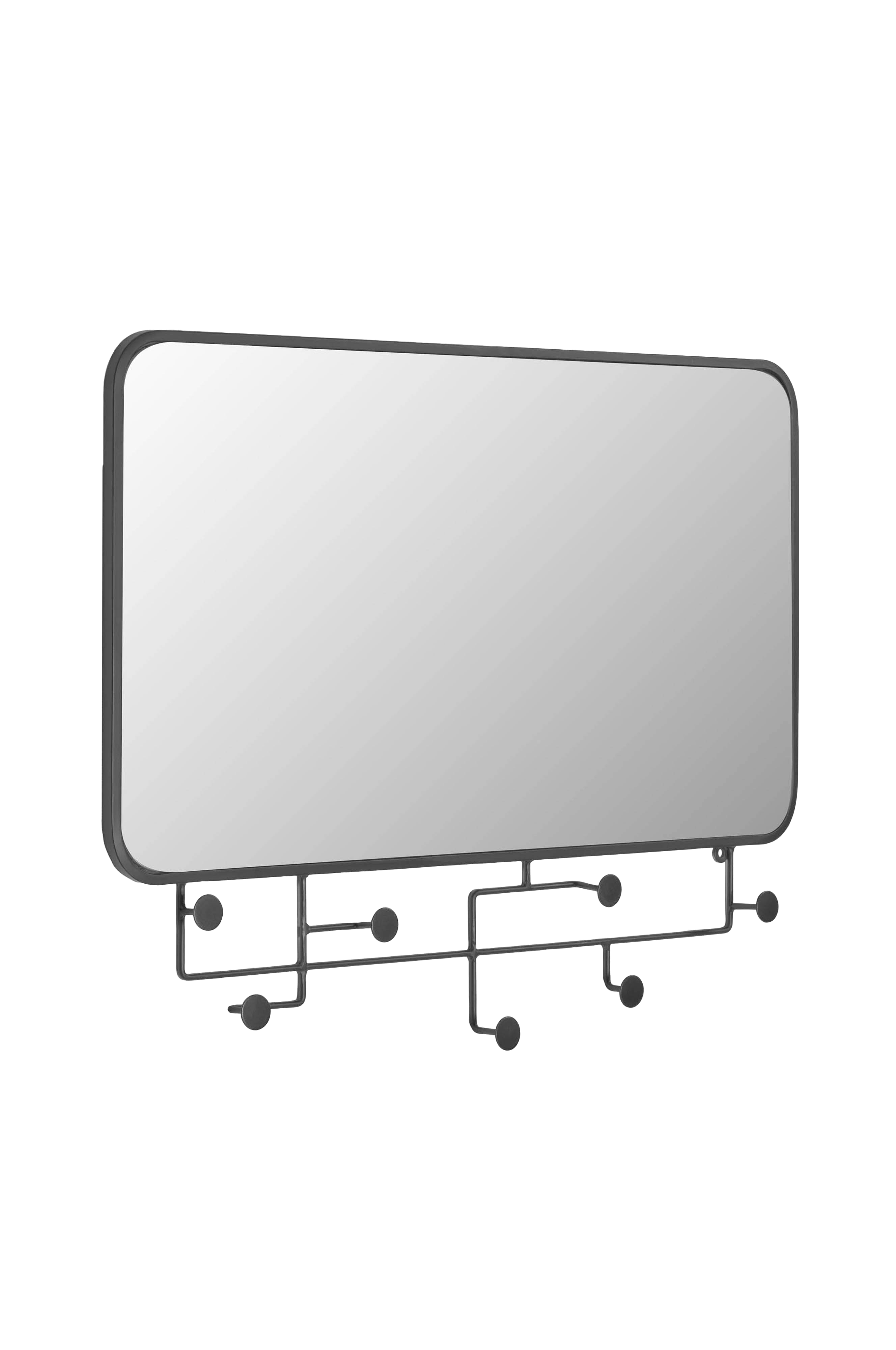 Speil stilen din i dette designspeilet av metall, med knagger til accessoirene. Du kan henge det vannrett eller loddrett, og det tar liten plass.