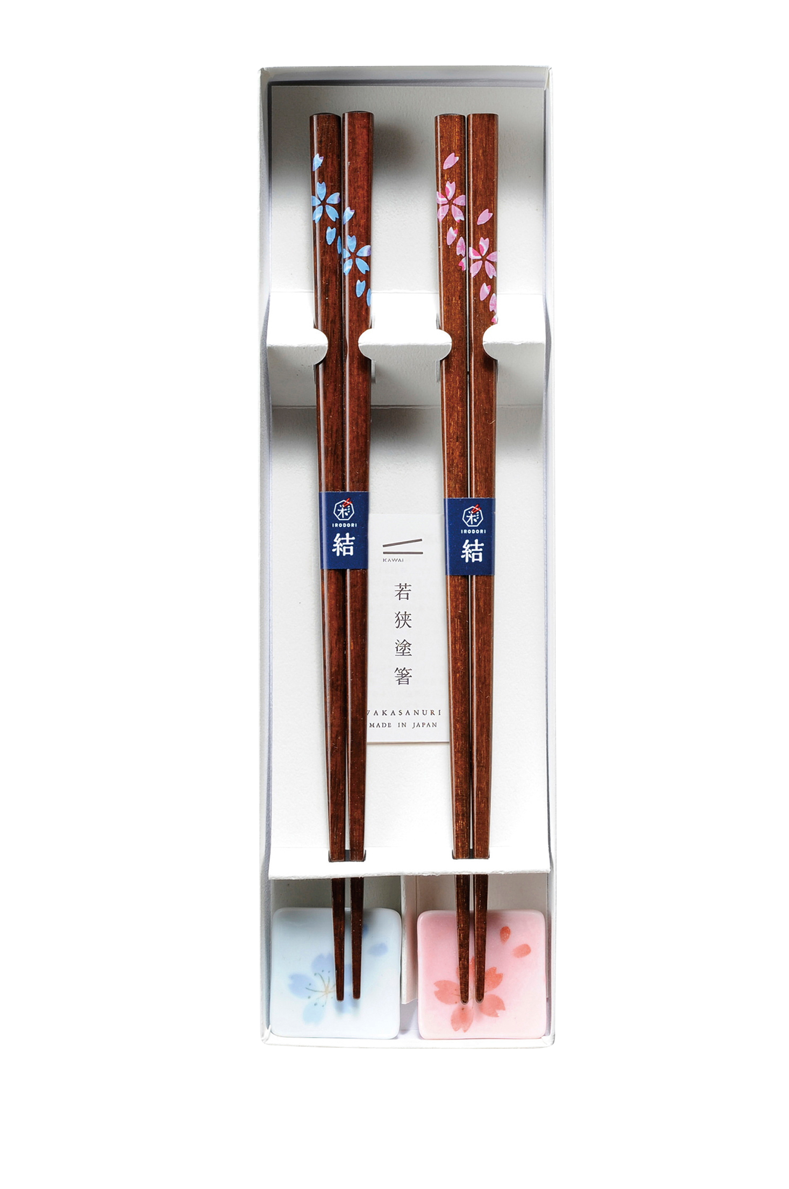 Gavesett med to par spisepinner og spisepinnestøtter med vakre japanske blomsterkranser, produsert i Japan, tåler oppvaskmaskin.