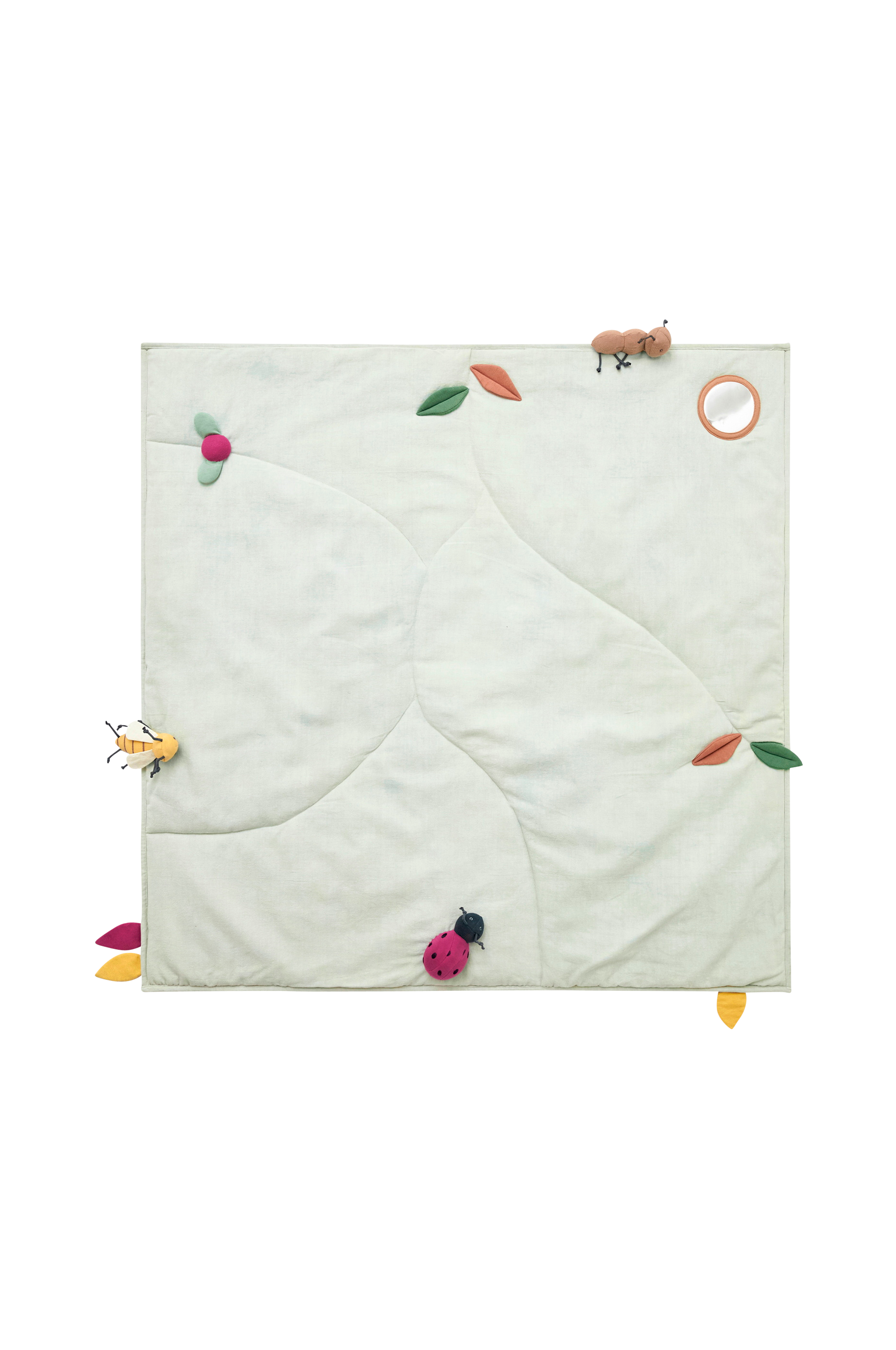 Vattert leke- og aktivitetsmatte i myk GOTS-merket bomull med påsydde figurer. Figurene har ulike funksjoner med blant annet pipelyd og rasling, og er i ulike materialer som babyen kan utforske.