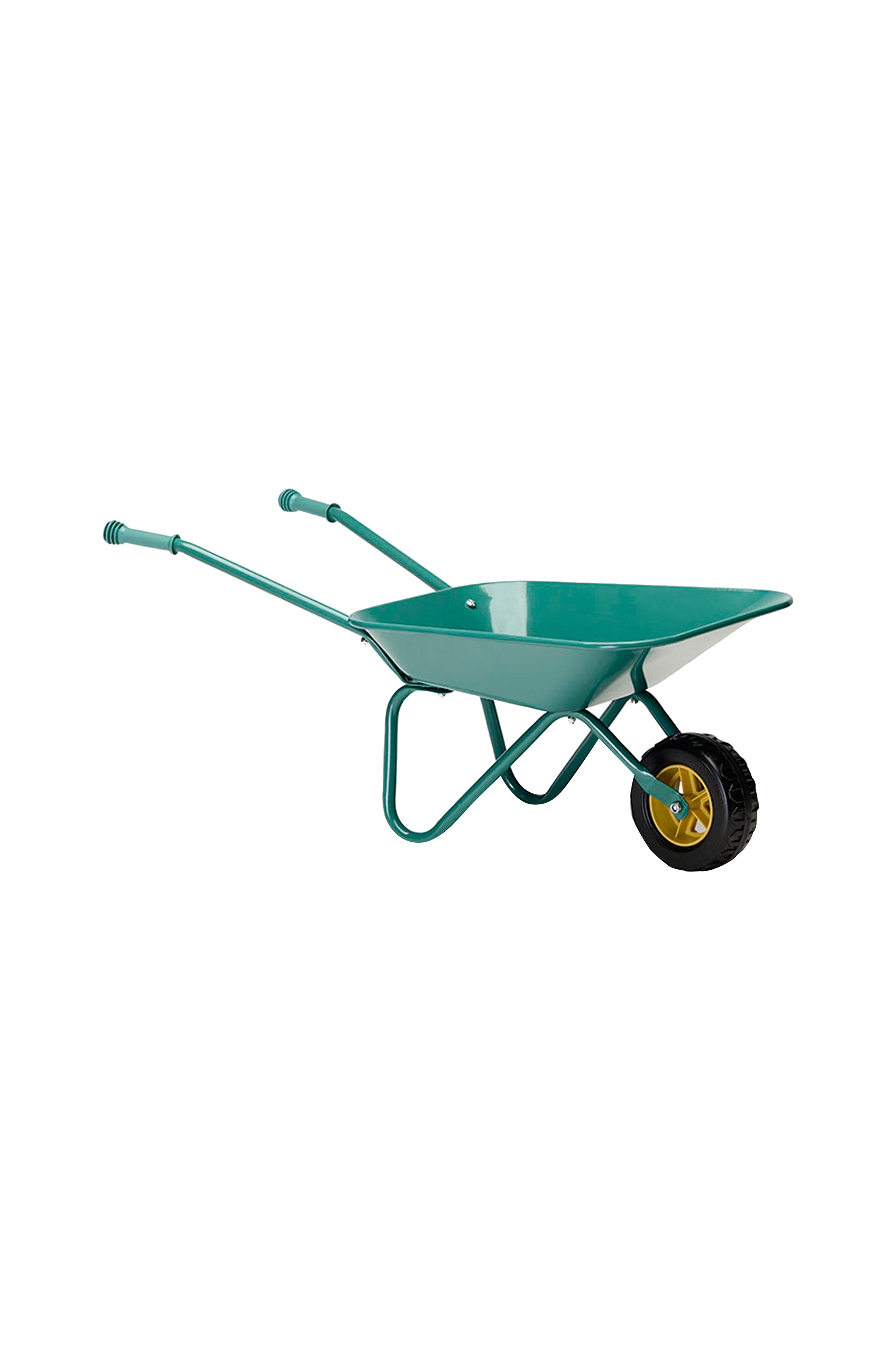 En pulverlakkert trillebår i metall med gummihjul og håndtak som gir et behagelig grep for små hender.