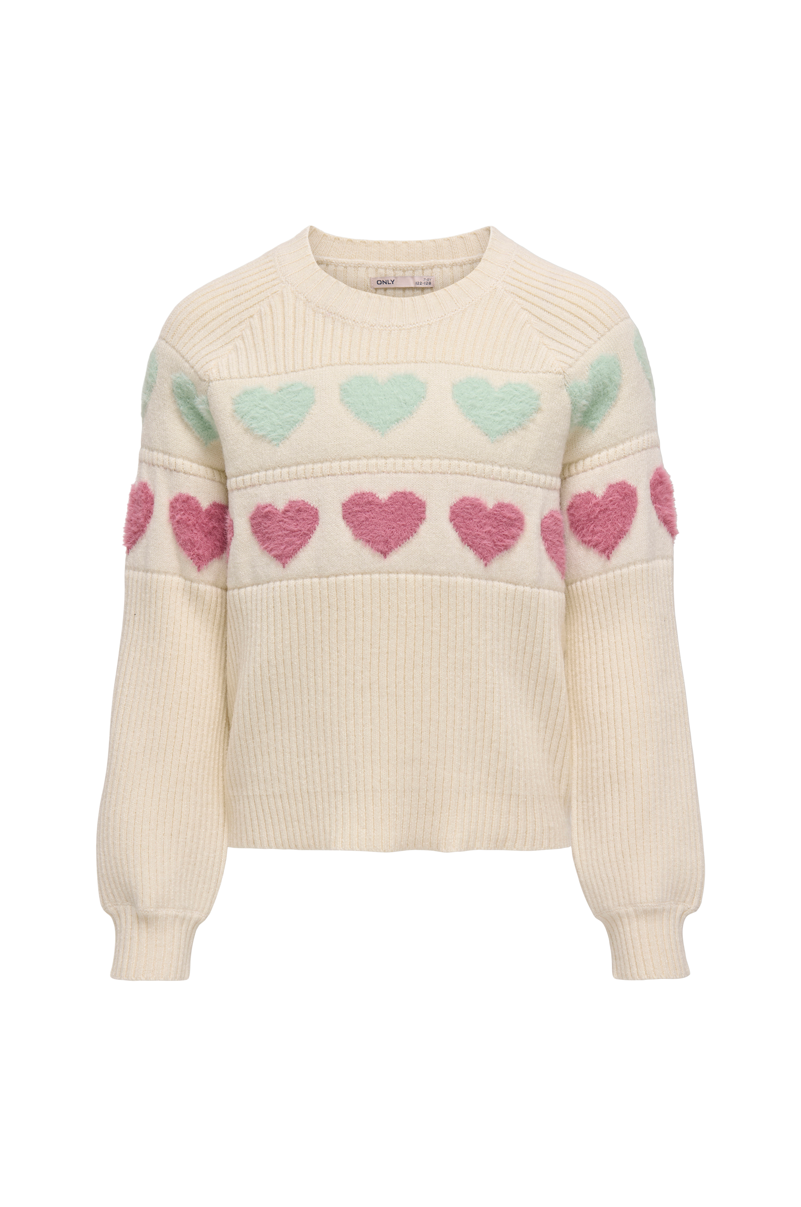 • Ribbestrikket genser i myk viskosemiks• Rund hals• Strikket hjertemønster rundt og på ermene• Lange ermer med utringede skuldre• Ribbestrikket pynt på bunnen, ved armenden og i halsen