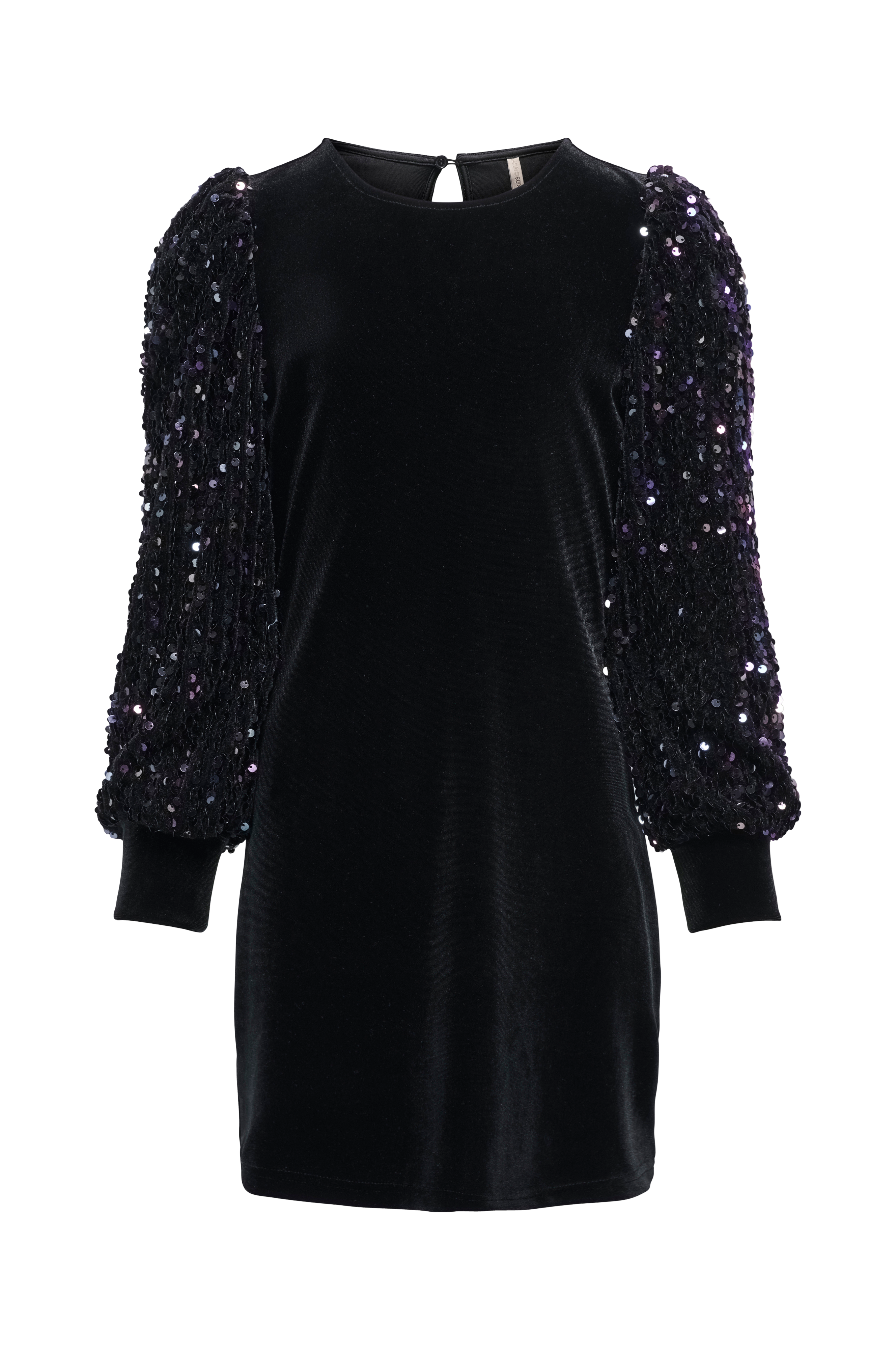 • Kjole i velur• Rund halsringning• Nøkkelhulsåpning bakpå• Lange puffermer• Dekorative paljetter