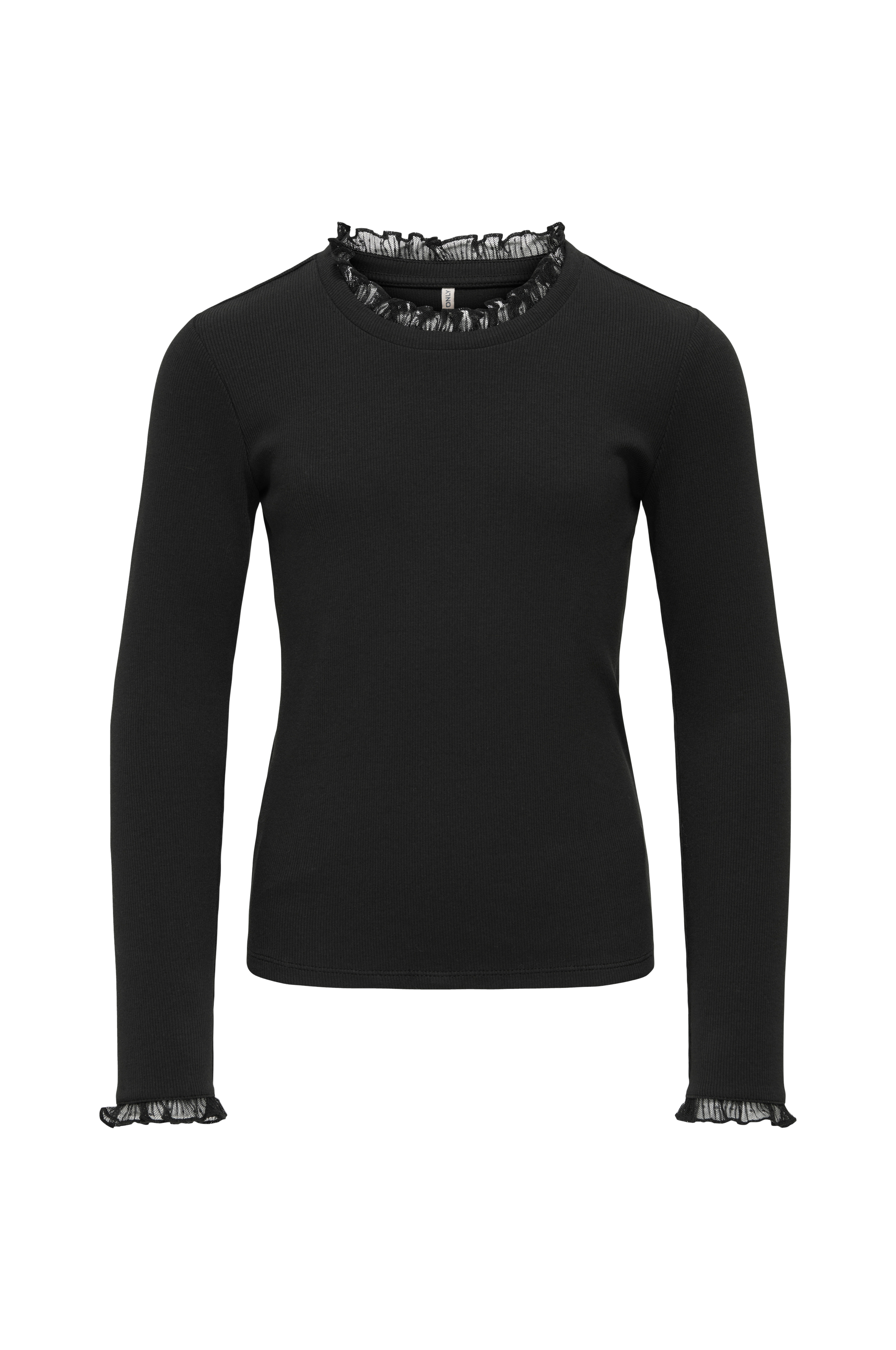 • Langermet, ribbet topp• Rund hals• Blondevolang på halslinjen og ved armenden