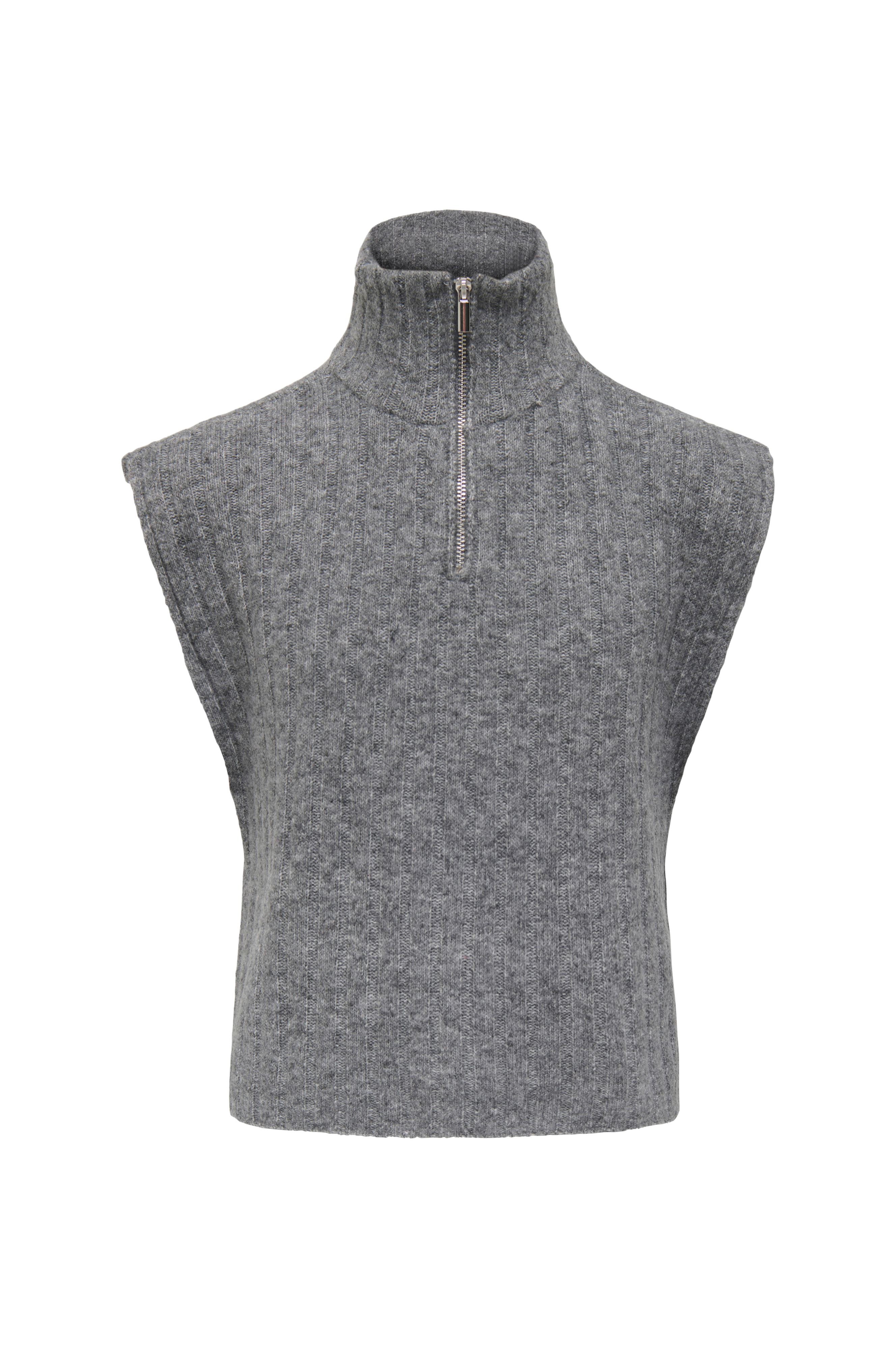 • Myk, ribbestrikket vest• Høy krage med glidelås• Skjær nede i sidene