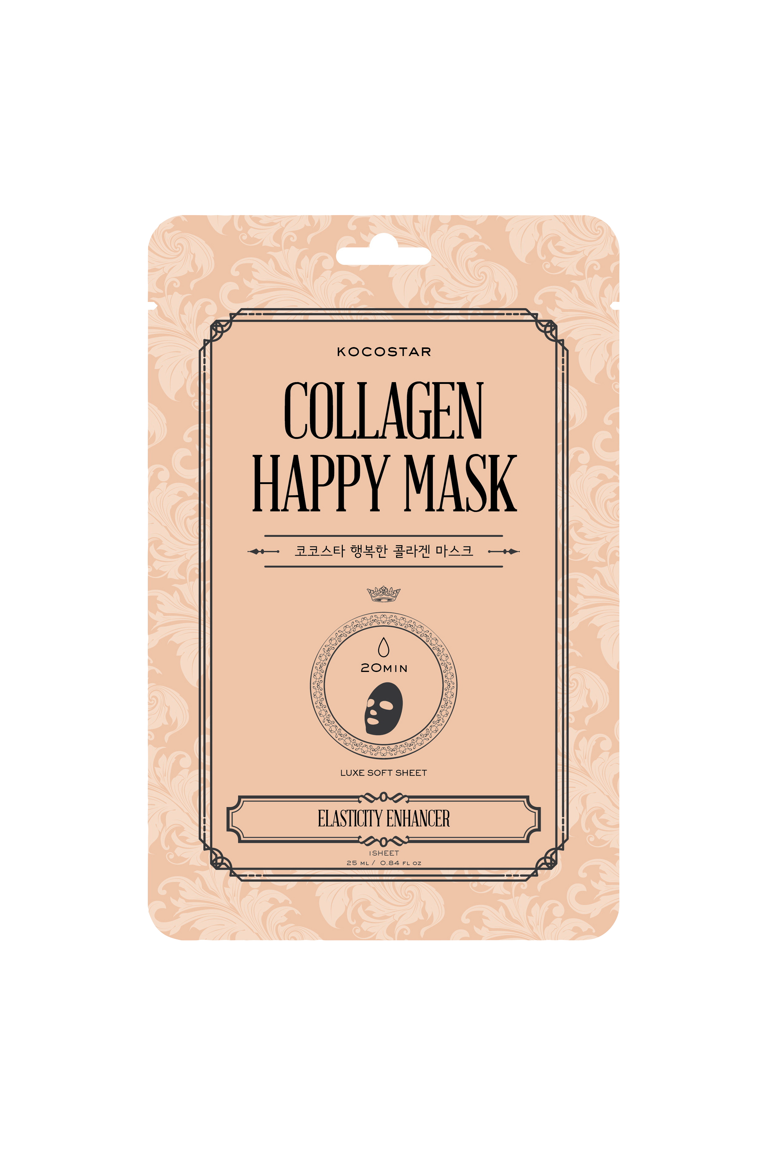 Collagen Happy Mask er en nærende ansiktsmaske i form av et ark som øker hudens naturlige produksjon av kollagen og får huden til å se mer smidig og ungdommelig ut. Stjerneingrediensen er plantekollagenekstrakt som etterligner det mest forekommende proteinet i kroppen, hvor rollen er å styrke og støtte huden samt holde den elastisk. Plantekollagenekstrakt absorberes raskt av huden og øker produksjonen av kollagen, samtidig som det bidrar til å gjenskape fasthet og elastisitet samtidig som det fukter huden. Næringsrik blæretangekstrakt og mandelolje forbedrer utseendet på linjer og gjør huden mykere. Masken er produsert av et mykt, pustende materiale og sitter fint på plass uten å glid av ansiktet.