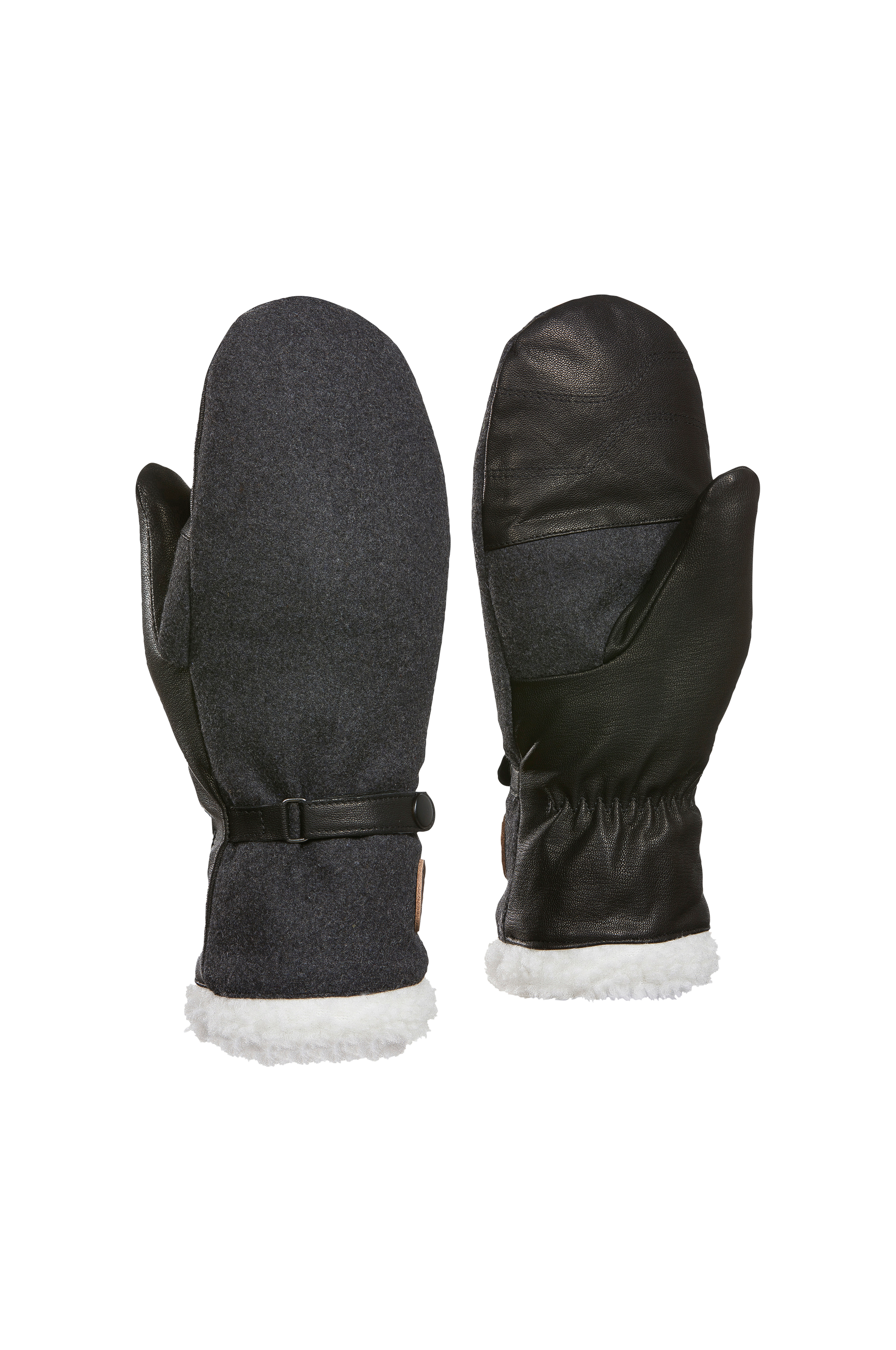 Votter LA Darling Mitt fra Kombi i tofarget modell i myk ullblanding og ekte skinn med varmende fôr i teddy. Strikk og smal rem med trykknapp rundt håndleddet.